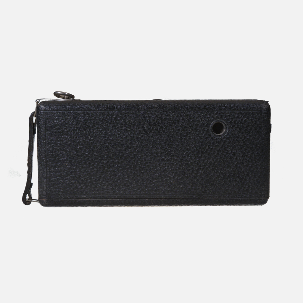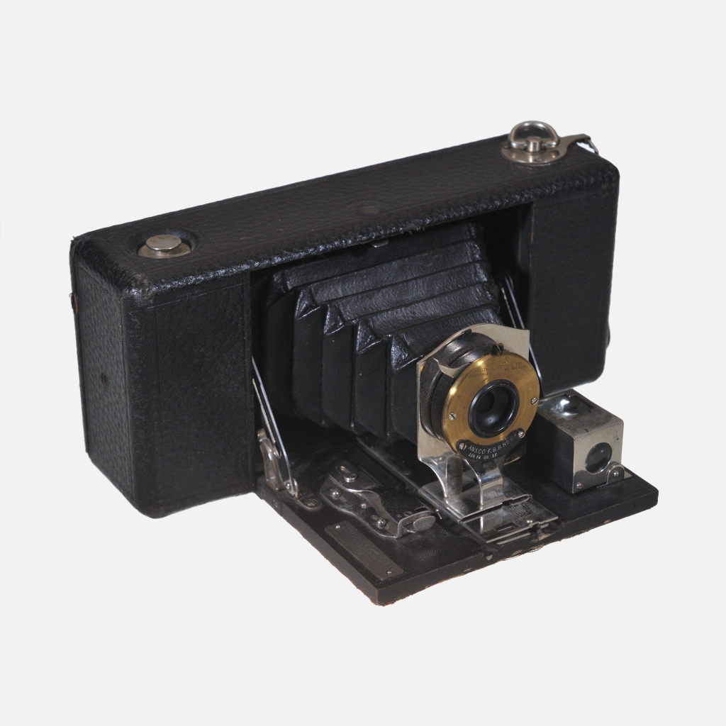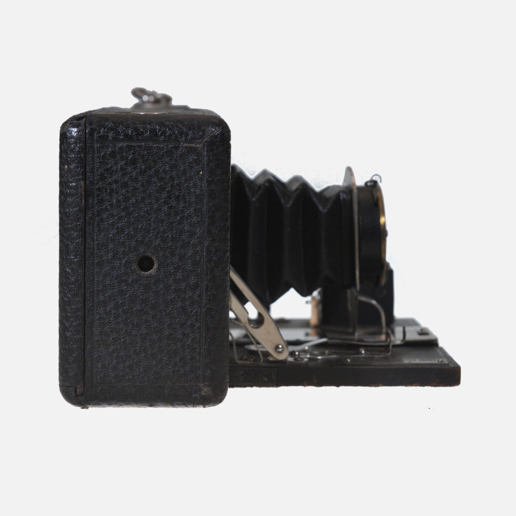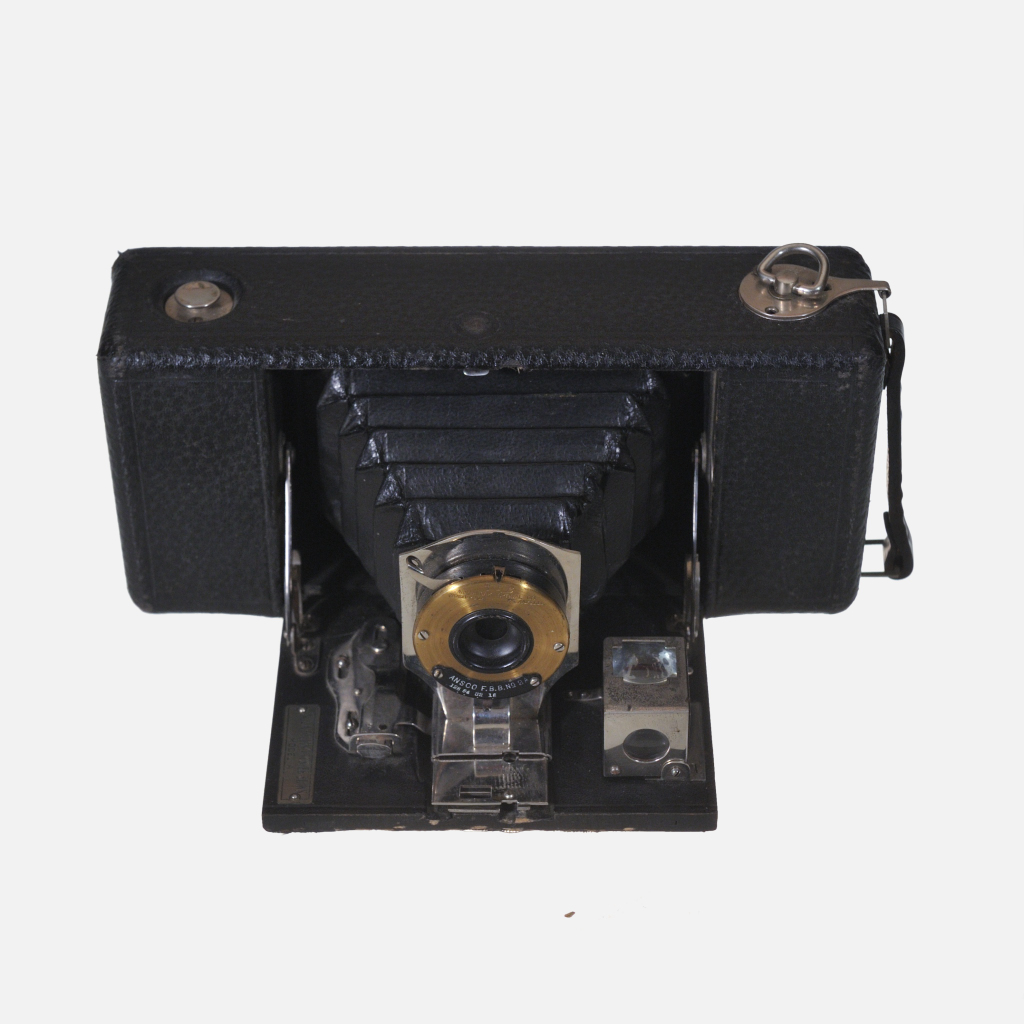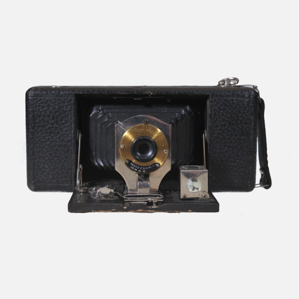 The Ansco Buster Brown Folding No.2A camera was produced by Ansco around the 1910s to early 1920s as an answer to Kodak’s popular Brownie box cameras. It features a basic wooden box design with the body made entirely of wood, including the internal film chamber, and covered in imitation leather. The camera uses No. 2A (116) roll film and includes both vertical and horizontal viewfinders. It has a shutter lever with a tab to select three aperture sizes, as well as a bulb mode for time exposures. A distinctive feature is the D-ring film advance key that flips out for film winding and tucks neatly away afterward. The camera was designed for ease of use, reliability, and to appeal to amateur photographers, born from the popularity of comic strips like “Buster Brown” which it was named after, paralleling Kodak’s Brownie naming.
