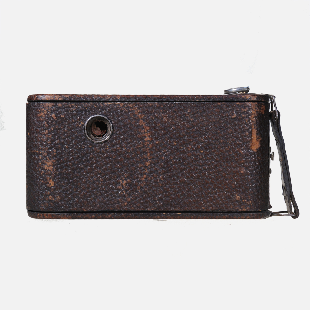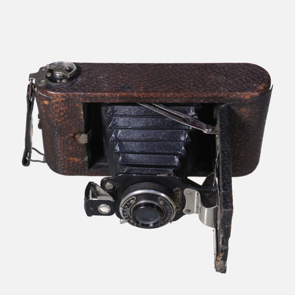 The Conley Junior 3 camera is a folding bed camera produced around 1913 to 1922 that uses 122 roll film to capture 3¼ x 4¼ inch exposures, with early models having a squared body and later versions featuring a more rounded design. It features a metal hooded wood body with red bellows, rack and pinion focusing, and a Wollensak lens paired with a Wollensak Junior Automatic 5-blade leaf shutter offering speeds including T, B, 1/100, 1/50, and 1/25 seconds. Notable for its leatherette-covered wooden body with a hinged back door for easy film loading, it includes a brilliant finder and supports tripod mounting for both horizontal and vertical shots, embodying classic early 20th-century roll film technology with robust, elegant construction and functional design. The camera was marketed mainly via Sears and is well-regarded as one of Conley’s first roll film models.