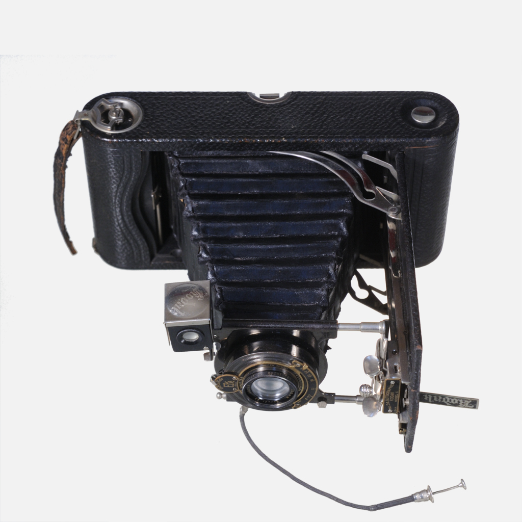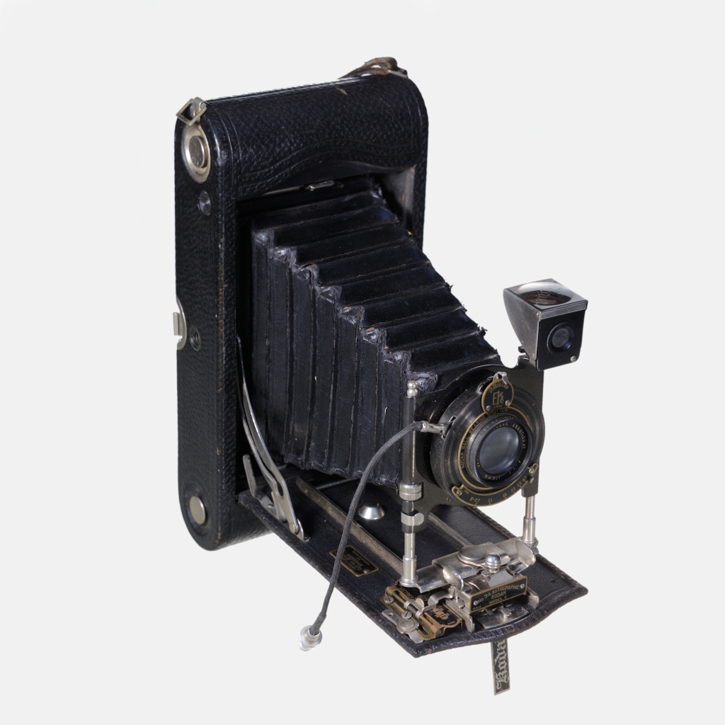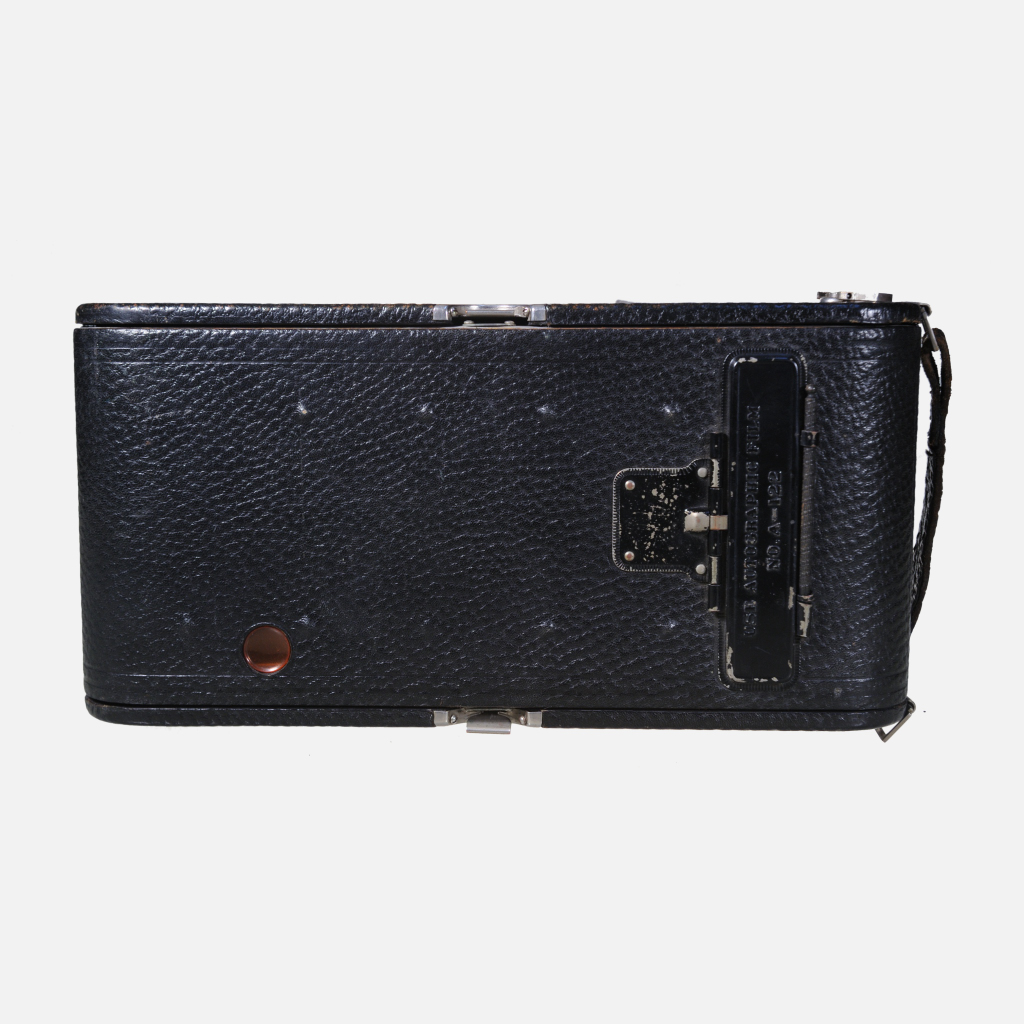 The Kodak 3A Autographic Model C is a vertical format folding camera produced by Eastman Kodak Company between 1912 and 1915. It uses 122 roll film, which produces postcard-sized negatives (3¼” x 5½”), and features a rising and cross front mechanism with a revised baseboard leather-covered layout. This model included a reflecting finder fitted to the lens standard and was among the last of the No 3A series before the autographic back became standard in 1914. The autographic feature allowed photographers to write notes directly onto the film margins using a metal stylus via a window on the back. It has a Bausch & Lomb Rapid Rectilinear two-element lens with a shutter offering speeds from 1/25 to 1/100 seconds plus bulb and time modes. The camera was originally fitted with red bellows, later changing to black, and includes a fine adjustment mechanism on the rising front and a lever-action lock on the cross front.