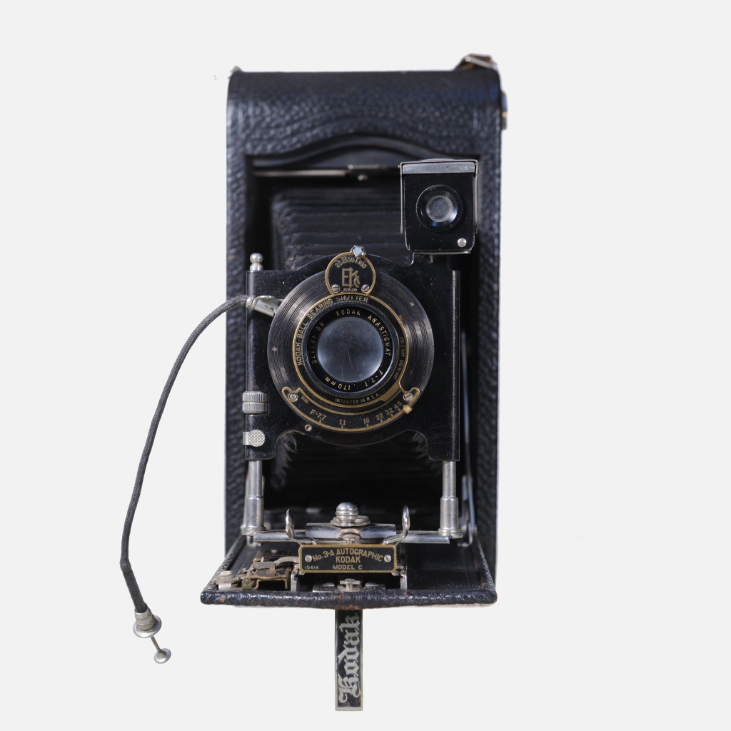 The Kodak 3A Autographic Model C is an early 20th-century folding camera designed for postcard-sized 122 roll film, notable for its autographic back that allowed photographers to inscribe notes on film margins.​