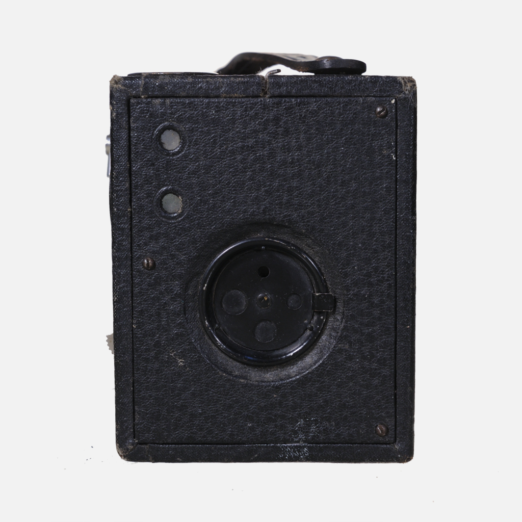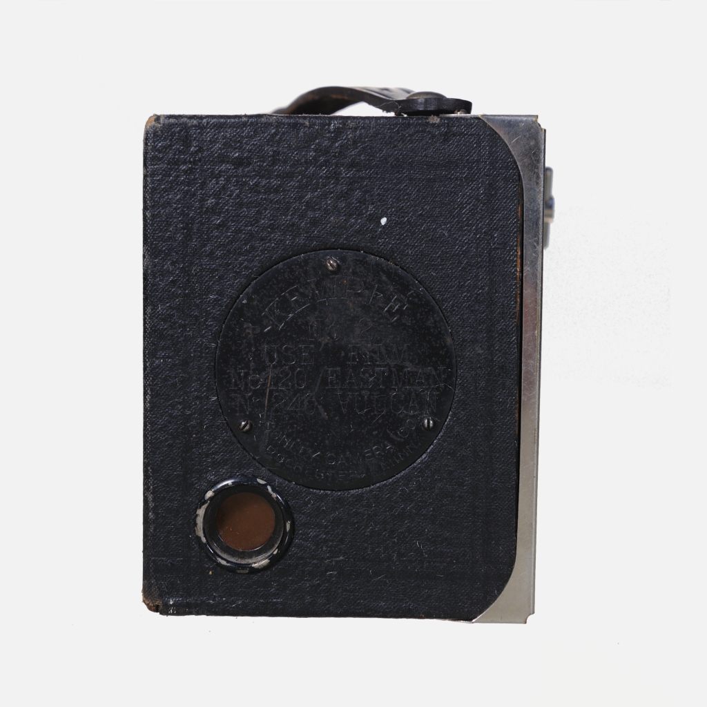 The Conley Kewpie No. 2 is an early 20th-century box camera made primarily of black stained wood with light gauge flat black-painted metal components, covered in a coated fabric likely to be pyroxylin, and was produced around 1917-1922. It uses 120 roll film to produce 6×9 cm images, offering eight exposures per roll, and features a simple, single-element meniscus lens with fixed focus. The camera has a fixed shutter speed of roughly 1/25 second and a rotating disk on the front lens for selecting among four apertures (f/14, f/16, f/22, and f/32), with a time (T) mode available for longer exposures. It has a manual winding mechanism with a side-mounted key and a ruby window on the back for film frame counting. Despite its basic design and age, it can produce surprisingly decent images with characteristic box camera softness and distortions.