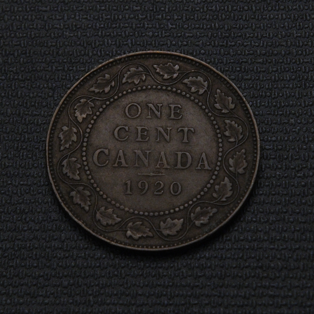 The 1920 Canadian Large 1 cent coin is a larger copper-based penny featuring King George V and a distinctive maple leaf design, minted before the penny size was reduced that same year.