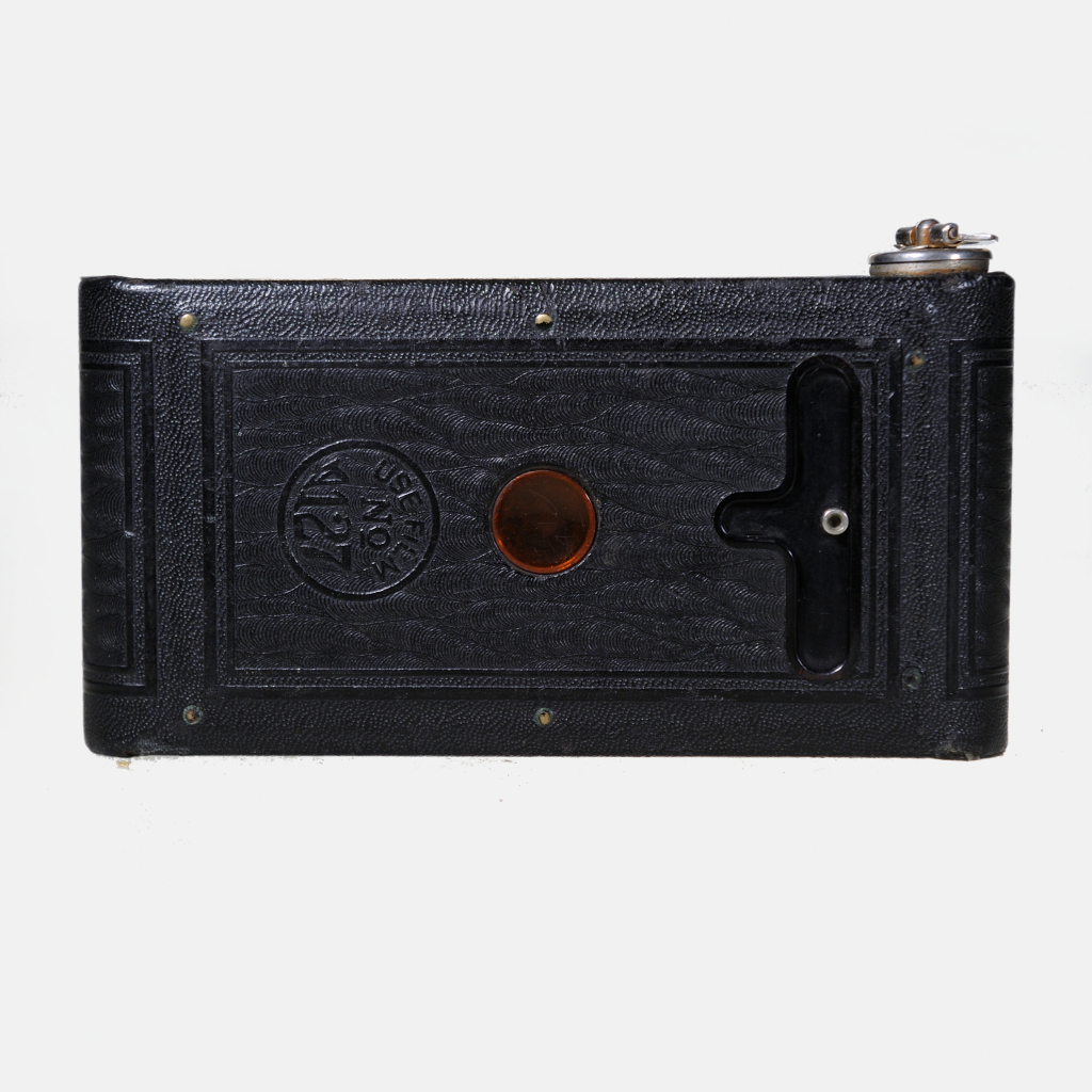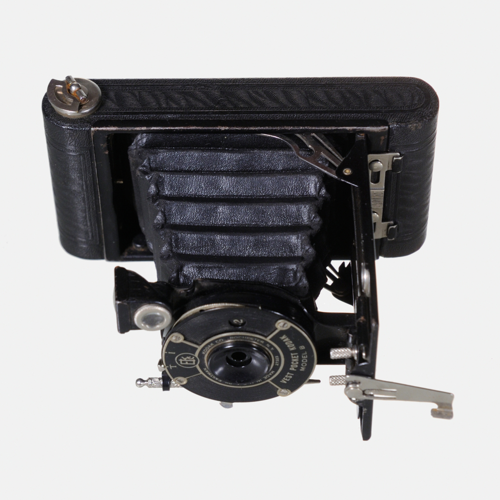 The Kodak Vest Pocket Model B is a compact, folding film camera introduced by Eastman Kodak Company between 1925 and 1934, designed to fit easily into a coat pocket and popular for its portability. Its all-black metal body features a bellows system and a meniscus lens, with film loaded via a removable back—a notable improvement from earlier models. The camera uses 127 roll film to capture eight exposures of 1 5/8 by 2 1/2 inch images, and some versions included an autographic back, allowing photographers to inscribe notes directly on negatives using a built-in stylus. Simple controls include a rotary shutter with instant (approx. 1/30 sec) and time modes and four aperture settings from f/11 to f/32, with a swiveling viewfinder for portrait or landscape framing. Sleek, minimalist, and easy to operate, the Model B remains an iconic example of Kodak’s early effort to make photography more accessible and mobile.