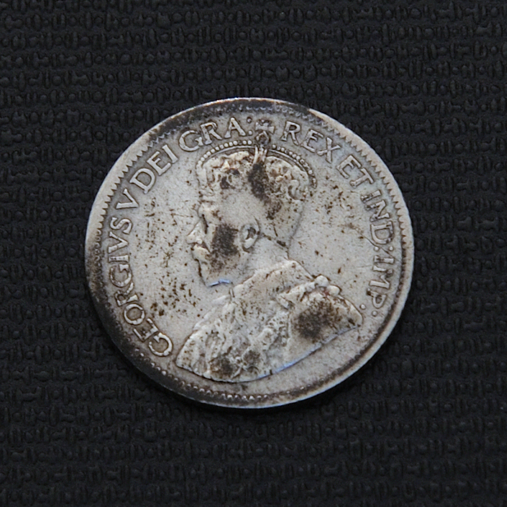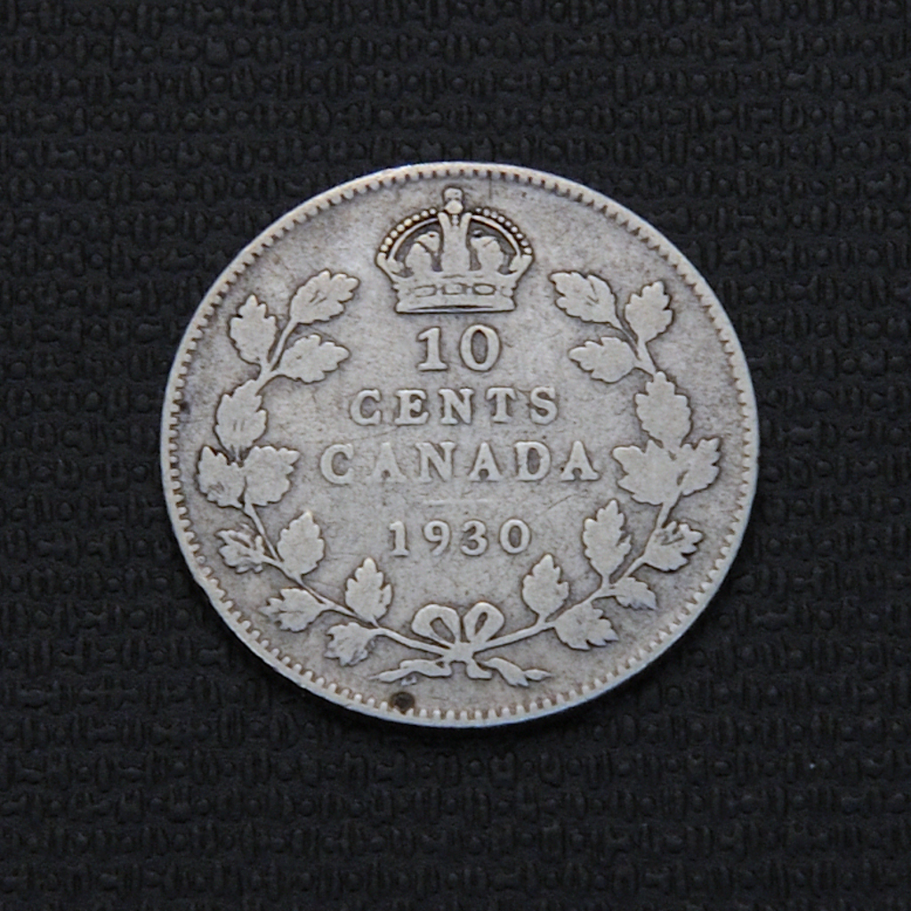 The 1930 Canadian 10 cents coin is a silver alloy coin featuring King George V’s bust on the obverse and maple leaves on the reverse.