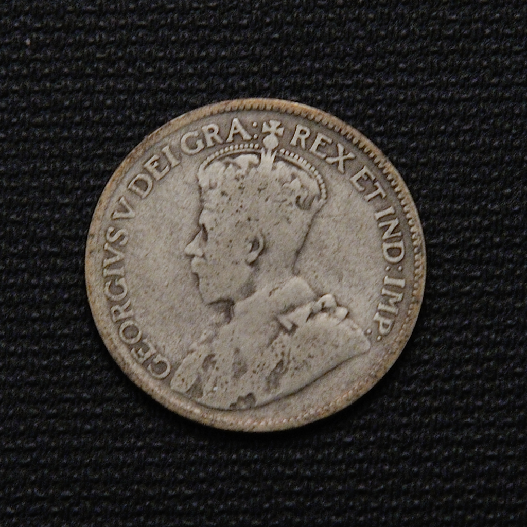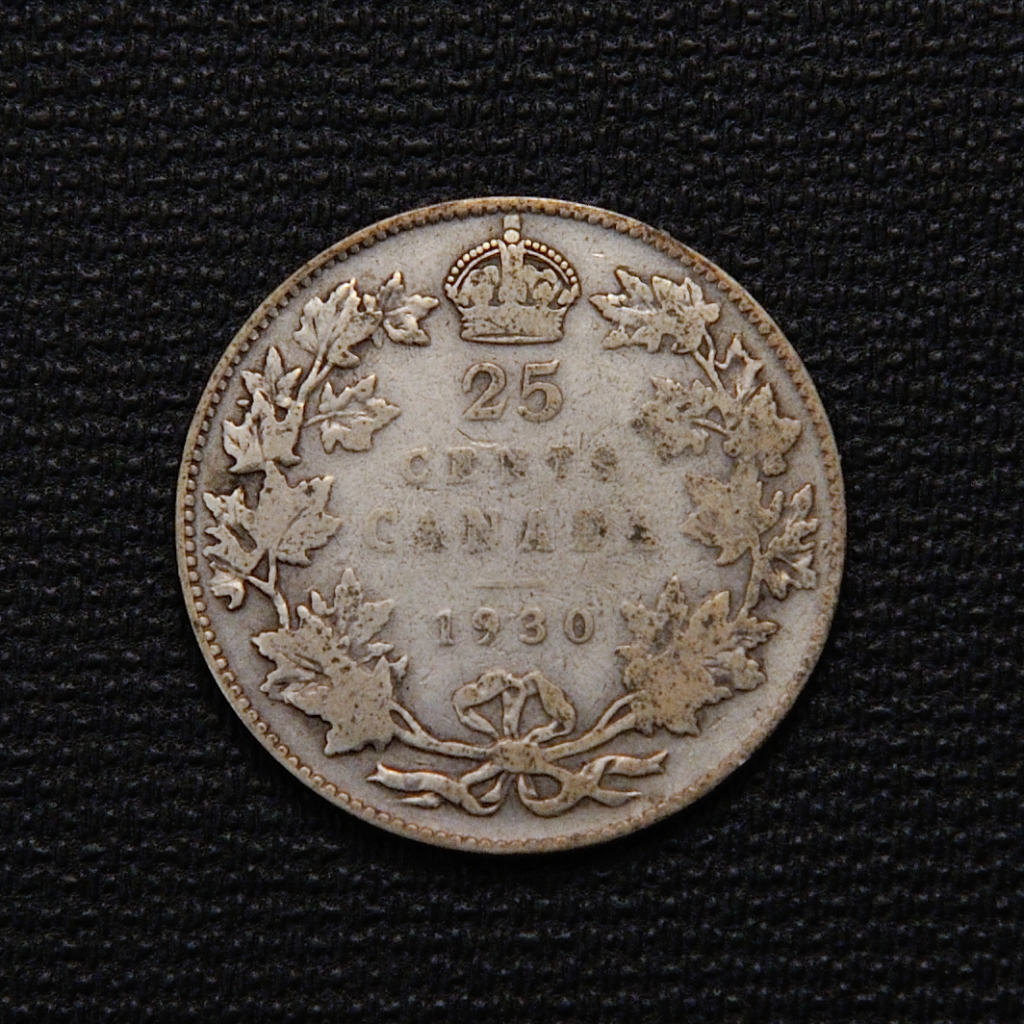 The 1930 Canadian 25 cents silver coin, minted by the Royal Canadian Mint, features an obverse with the bust of King George V surrounded by the inscription “GEORGIVS V DEI GRA : REX ET IND : IMP :”, reflecting the monarch’s reign during that era. The reverse displays a crowned maple leaf on two boughs tied with a ribbon, symbolizing Canada’s identity and resilience. Composed of 80% silver and 20% copper, the coin weighs 5.83 grams with a diameter of 23.62 mm, has a reeded edge, and a medal alignment axis. It was produced in the midst of the Great Depression, embodying the endurance of the Canadian people, and its design was crafted by Sir Edgar Bertram Mackennal (obverse) and William Henry James Blakemore (reverse). This coin is valued both as a collector’s item and for its silver content.