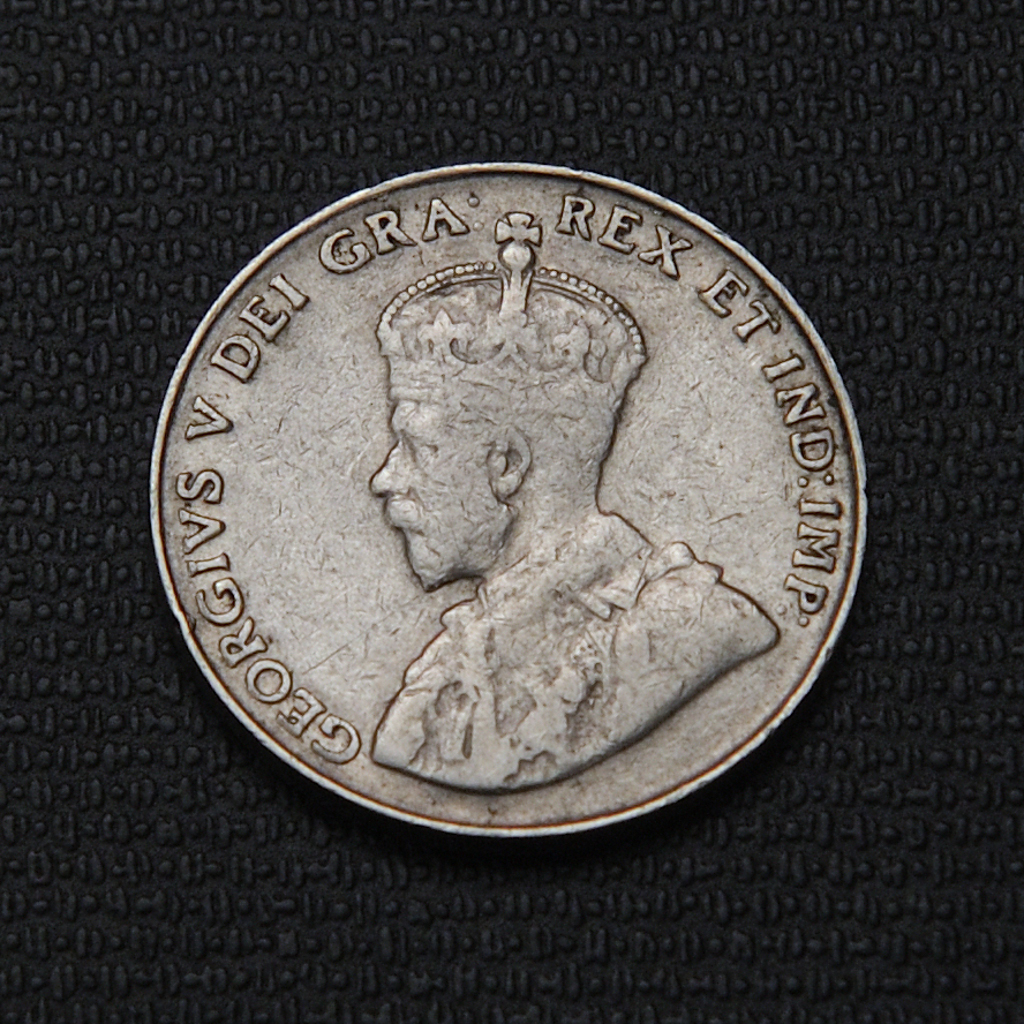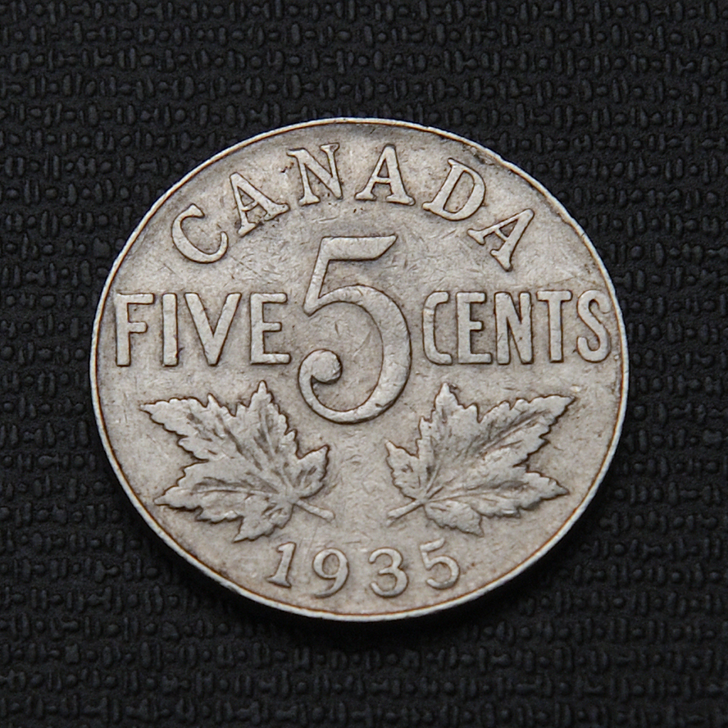 The 1935 Canadian 5-cent coin, made of pure nickel, features the obverse with a bust of King George V and the Latin inscription “GEORGIVS V DEI GRA: REX ET IND: IMP,” and the reverse depicts two maple leaves with the denomination and the year 1935, weighing 4.54 grams with a diameter of 21.21 mm.