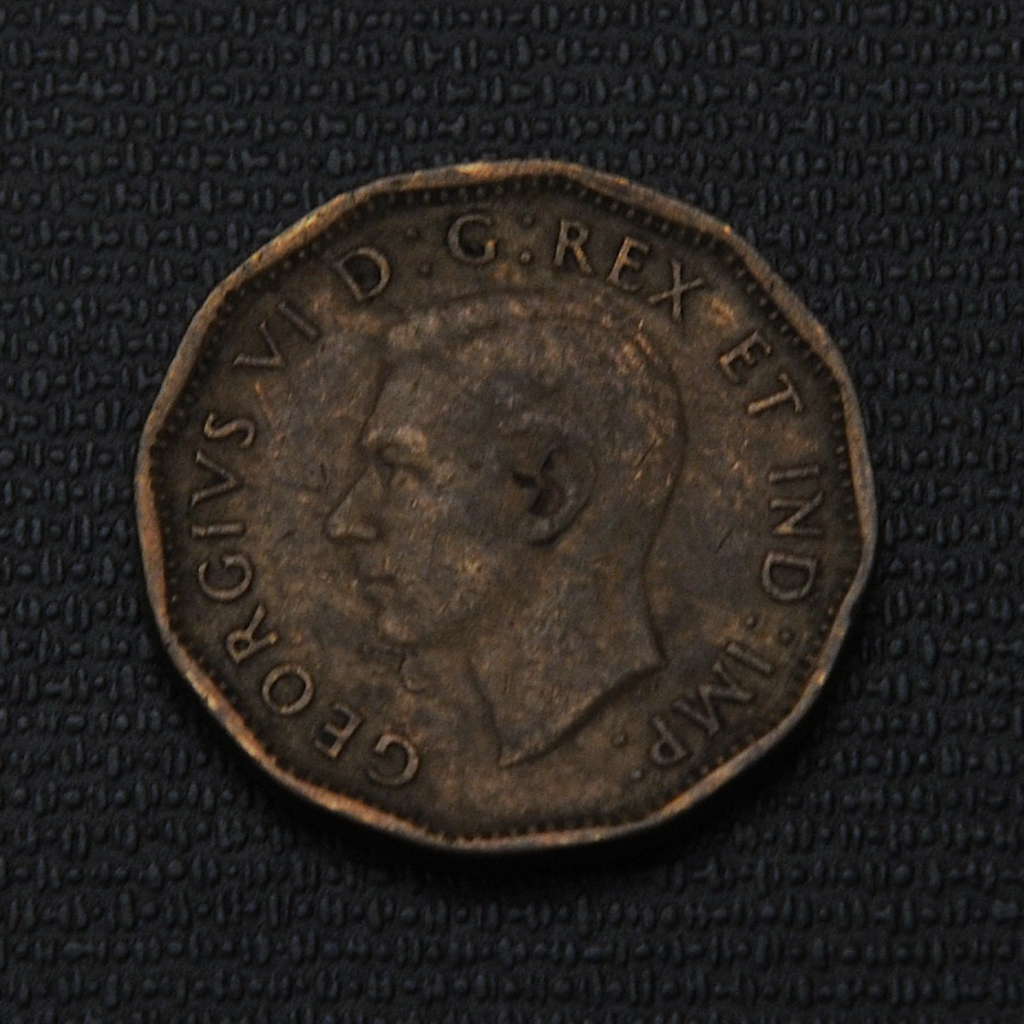The 1943 Canadian 5 cents coin made of tombac is a unique wartime issue created due to the rationing of nickel during World War II. Instead of nickel, this coin was made from tombac, a brass alloy consisting of 88% copper and 12% zinc, and it features a distinctive dodecagonal (12-sided) shape to differentiate it from the bronze one-cent coin. The coin’s design replaced the traditional beaver image on the reverse with a large “V” symbolizing both victory and the five-cent denomination, accompanied by a torch in the center and an international Morse code message around the rim reading “We win when we work willingly.” The obverse displays the portrait of King George VI, and the coin has a plain edge, weighs 4.54 grams, and measures about 21.1 millimeters in diameter. This coin was produced only in 1943 and 1944 as a special wartime issue by the Royal Canadian Mint, designed by Thomas Shingles, and serves as a patriotic symbol from Canada’s World War II era.