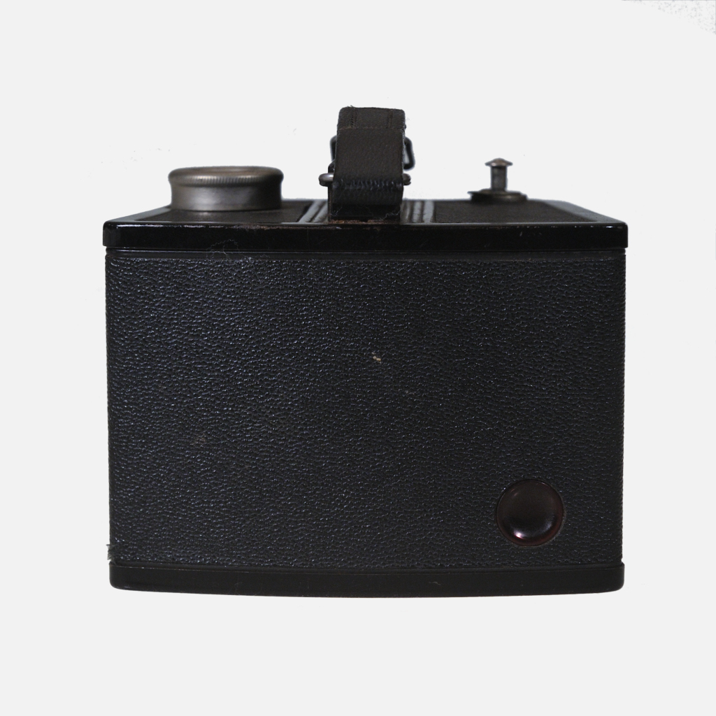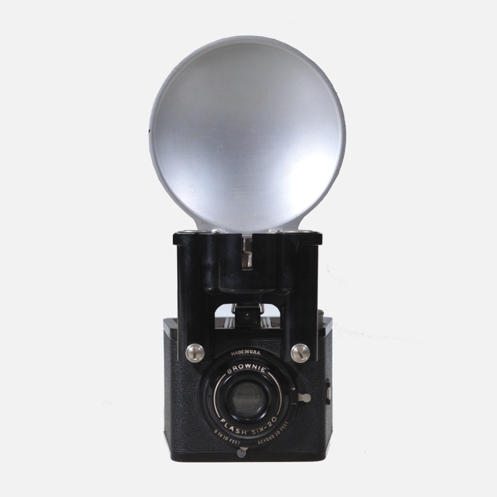 The Kodak Brownie Flash Six-20 camera is a sturdy, metal-bodied box camera manufactured in the United States between 1946 and 1955, notable for its oddly shaped design and reputation for indestructibility. It was intended for mass market use and captured eight exposures per roll of 620 film, producing 2¼ x 3¼ inch images. Features include an optical direct vision finder, a built-in close-up lens for portraits, simple shutter settings for instant (I) and bulb (B) exposures, and compatibility with a large, attachable flashgun. Though the camera lacked multiple aperture settings, it offered practical additions like a tripod socket, exposure guards, and a leveling tab—making it ideal for amateur photographers seeking both reliability and ease of operation.