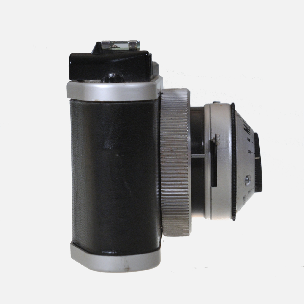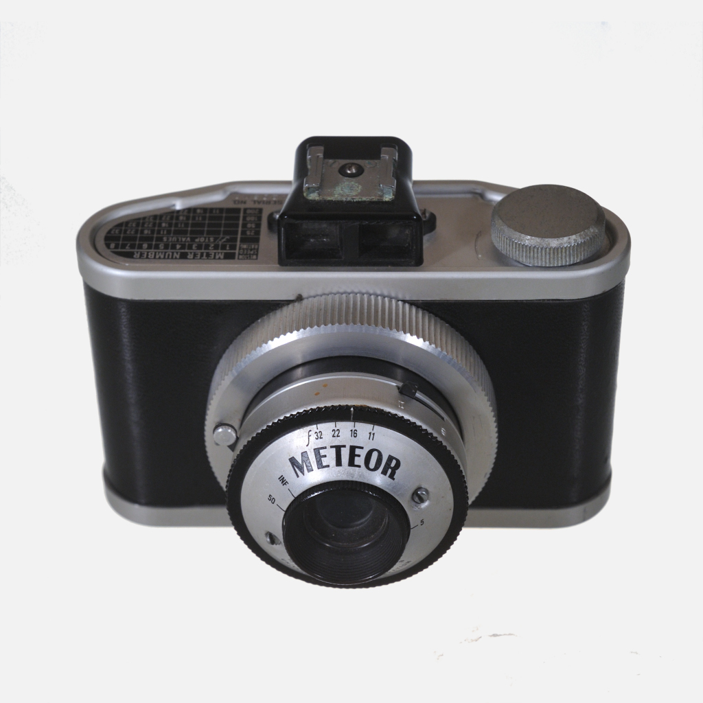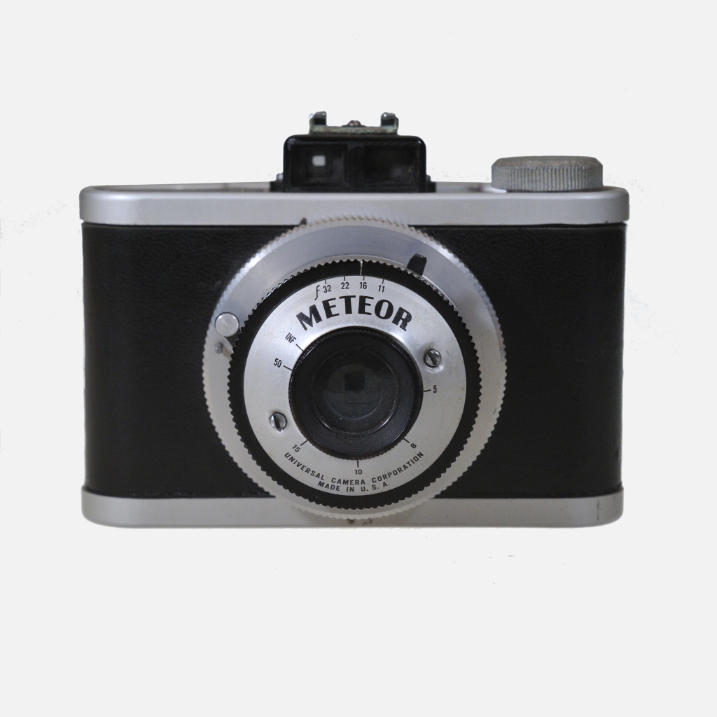 The Meteor Universal Camera Corp camera, known as the Universal Meteor, is a 620 film camera produced around 1947-1949 by the Universal Camera Corporation in New York City. It features a small, streamlined body with a pull-out lens tube and a coated lens that can be guess focused from infinity to 5 feet. The camera exposes 2¼” square images (6×6 cm) on 620 film and includes a self-resetting shutter with “instant” and “bulb” modes selectable via a lever on the lens barrel. It has four aperture settings (f/11, f/16, f/22, f/32) and uses an extinction meter for light metering, alongside a metal plate showing Weston film speeds (ISO 25, 50, 100, 200). The viewfinder is small and not coupled with the lens, and the film loading chamber opens from the bottom instead of a removable back. Originally priced around $15, the camera is noted for its vintage character and distinctive features, although it has limited coverage in modern collections.