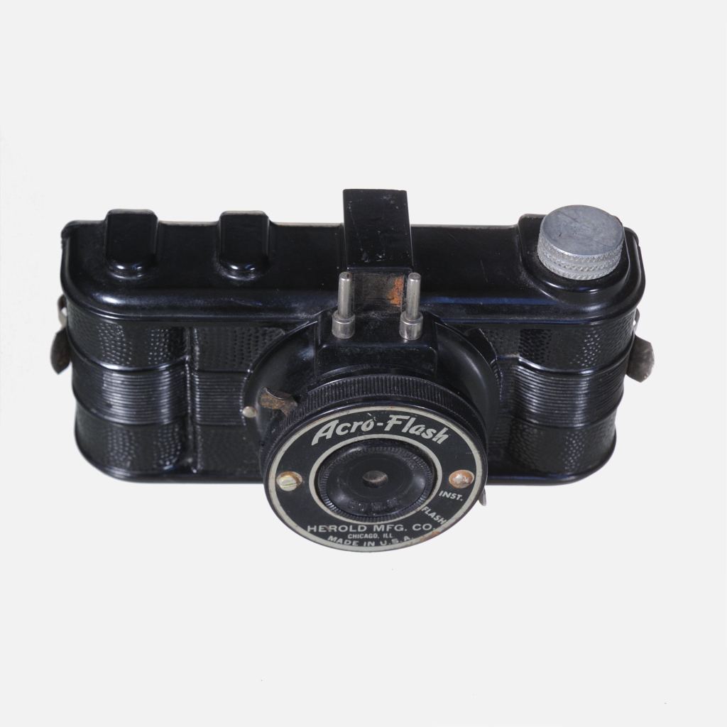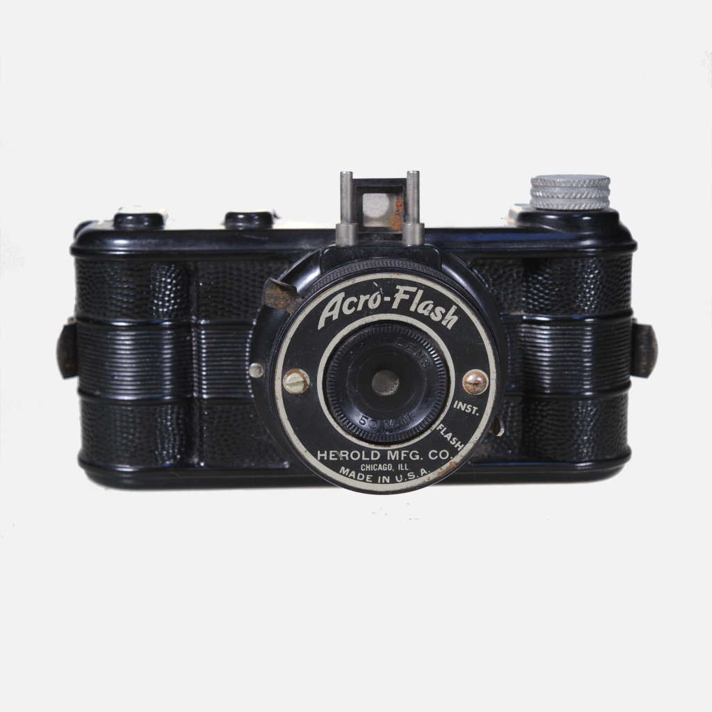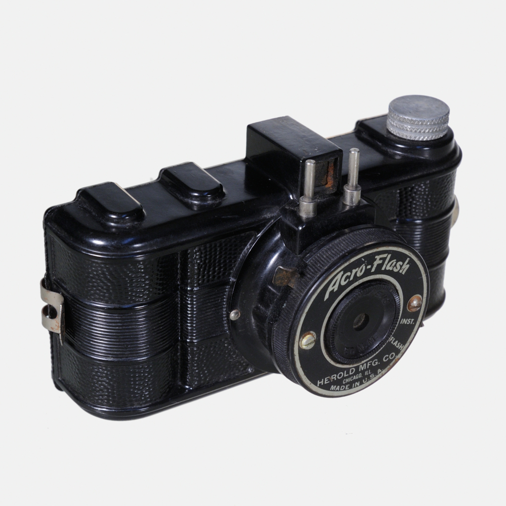 CamérasThe Acro-Flash camera is a simple bakelite molded plastic camera made by Herold Manufacturing Company in the early 1950s, featuring a built-in viewfinder and flash synchronization with contacts in front of the viewfinder, and using standard no. 127 roll film with a fixed focus 50mm lens and instantaneous shutter.