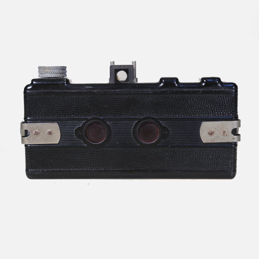 The Acro-Flash camera, produced by Herold Manufacturing Company from 1951 to 1955, is a simple, compact camera made of molded bakelite plastic with a built-in viewfinder. It uses standard No. 127 roll film, capturing 16 photos per roll, and features a fixed-focus 50mm Graf lens with an instantaneous shutter. Its notable feature is flash synchronization achieved through contacts located in front of the viewfinder, making it one of the early cameras designed with built-in flash capability, often marketed as an affordable and easy-to-use camera for casual photographers, including children.