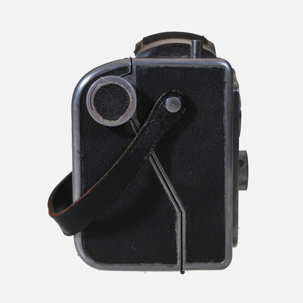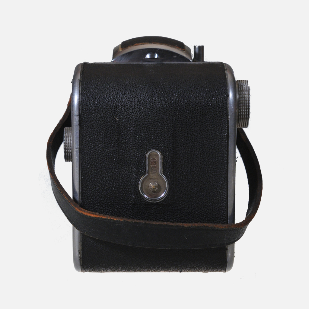 The 1953 Sears Roebuck Tower 120 Flash camera is a medium format, box-style camera that uses 120 film to produce 6×9 cm exposures. It is a simple, fixed-focus camera with a meniscus lens and rotary shutter, designed for ease of use with basic point-and-shoot functionality. The camera features dual waist-level viewfinders for both portrait and landscape composition and has flash synchronization contacts to work with a flash unit using single-use flash bulbs. It is primarily made of metal construction, and its film loading system involves a rear removable box, with a red window for frame counting. The camera requires no power source for operation apart from the flash unit, which uses batteries. Notably, this model was made for Sears by the German manufacturer Ising (not Bilora, which made later versions), and it epitomizes post-war accessible photography for casual consumers. While lacking adjustable settings, it was a practical and economical option for beginners in 1953, reflecting the company’s mail order retail prominence at the time.