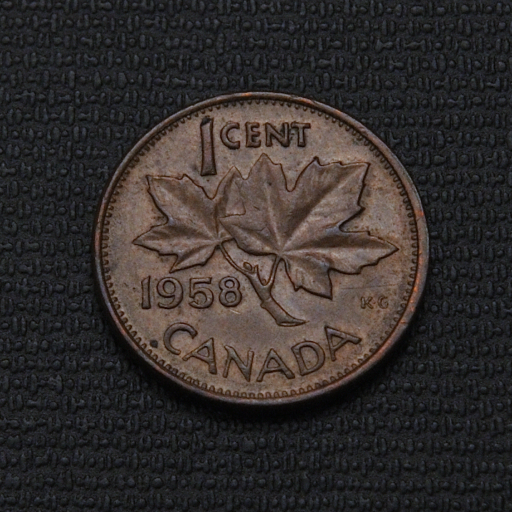 The 1958 Canadian 1 cent coin is a copper-based coin featuring a young Queen Elizabeth II on the front and two maple leaves on a twig on the back, symbolizing Canadian heritage.