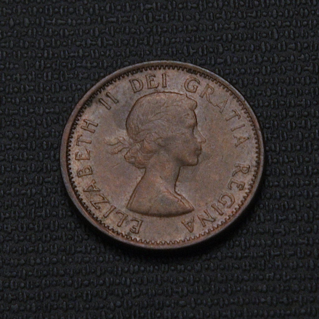 The 1958 Canadian 1 cent coin is a bronze coin composed of 98% copper, 0.5% tin, and 1.5% zinc, weighing 3.24 grams with a diameter of about 19.05 mm and a plain edge. It features on the obverse a youthful bust of Queen Elizabeth II, designed by Mary Gillick, where she is shown wearing a laurel wreath, accompanied by the inscription “ELIZABETH II DEI GRATIA REGINA.” The reverse side, designed by G. E. Kruger-Gray, depicts two maple leaves on the same twig with the inscriptions “1 CENT 1958 CANADA,” representing the iconic Canadian symbol. This coin was circulated in large quantities (over 59 million minted) and holds both historical and collectible value, with uncirculated examples fetching higher prices among collectors today.