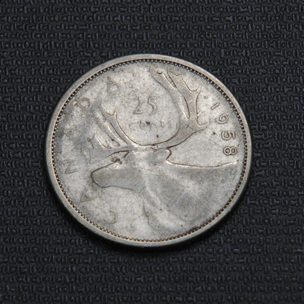The 1958 Canadian 25 cents quarter is a silver coin composed of 80% silver and 20% copper, featuring on the obverse a laureate bust of Queen Elizabeth II with the inscription “ELIZABETH II DEI GRATIA REGINA,” and on the reverse a left-facing caribou head designed by Emanuel Hahn, with the denomination “25 CENTS” and the date below, minted by the Royal Canadian Mint with a diameter of 23.88 mm and weight of 5.83 grams.
