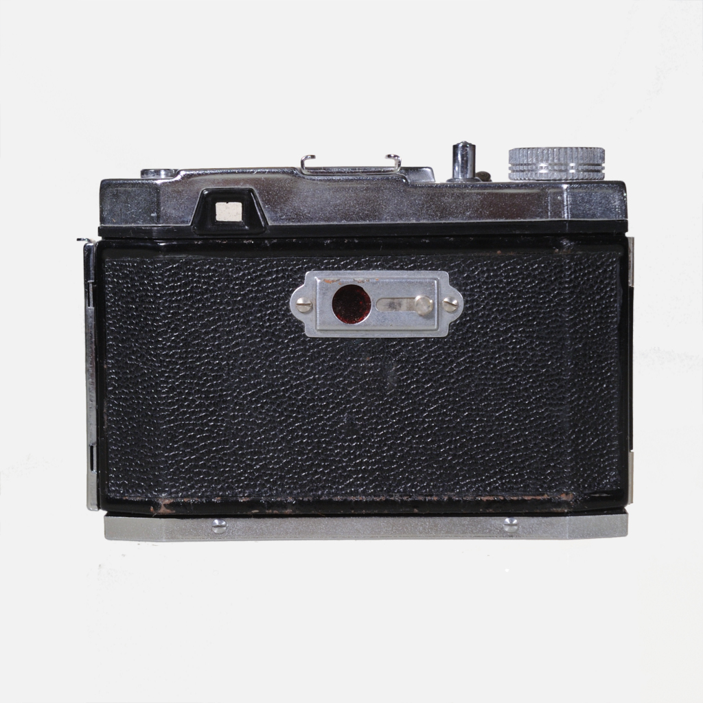 The Anny 44 is an inexpensive Japanese camera made by Hōei around 1960 that takes 4×4 cm pictures on 127 film. Its body mimics a 35mm rangefinder camera with design elements inspired by Nikon models, including a fake rangefinder window that actually works as a shutter lock indicator. It features a fixed-focus lens marked HOEI LENS 1:8 F=5cm and has an aperture lever with settings from f/8 to f/22 tailored for different light conditions, but it has a single shutter speed with no speed control. The camera has a top right film advance knob, a red window for film frame counting covered by a sliding cover, an accessory shoe, and a PC synch connector for flash. Despite its toy-like build and basic optics, it produces surprisingly sharp photos at the center, making it a quirky collectible point-and-shoot with a nostalgic vintage charm.
