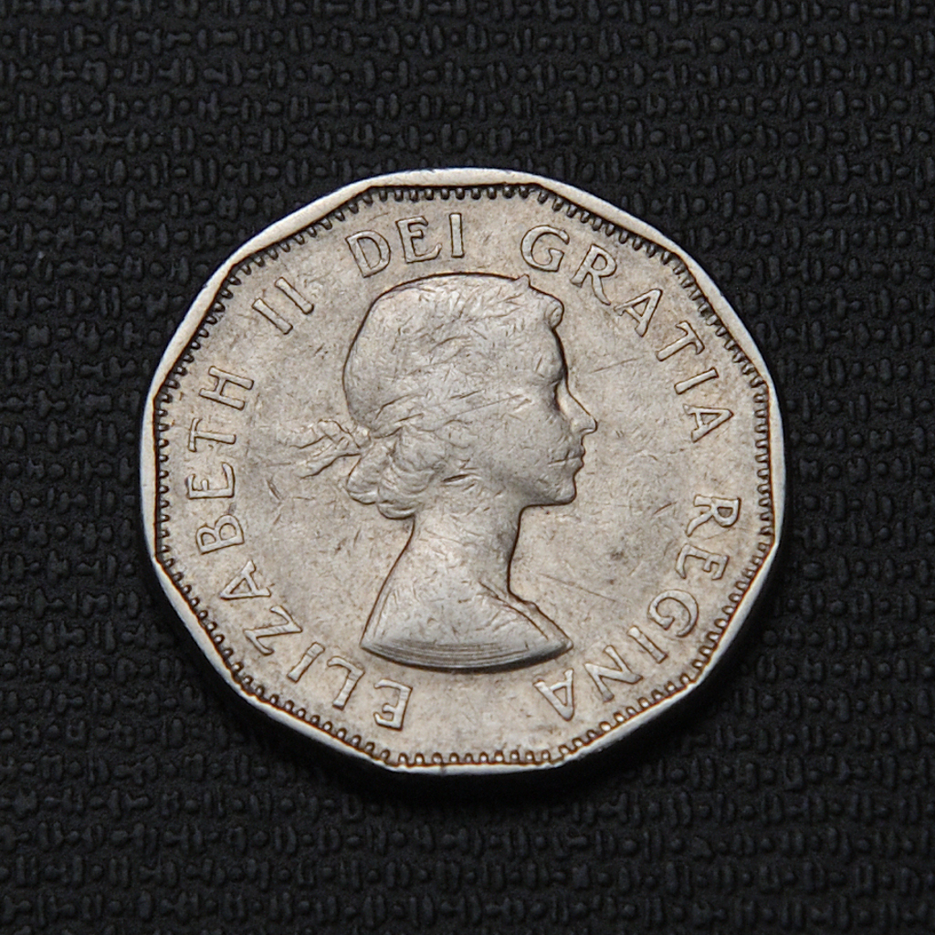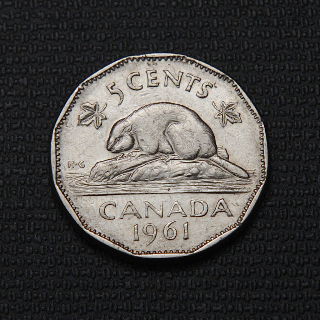 The 1961 Canadian 5 cents coin features a nickel composition with a smooth plain edge and a diameter of approximately 21.2 mm. The obverse showcases a laureate portrait of Queen Elizabeth II, designed by Mary Gillick, with the Latin inscription “ELIZABETH II DEI GRATIA REGINA.” The reverse displays the iconic beaver sitting on a rock-studded mound of earth rising out of the water, designed by G.E. Kruger-Gray, including the inscriptions “5 CENTS” and “CANADA 1961.” It was minted by the Royal Canadian Mint with a total mintage of about 47.9 million, making it a widely circulated coin with magnetic properties due to its nickel content.