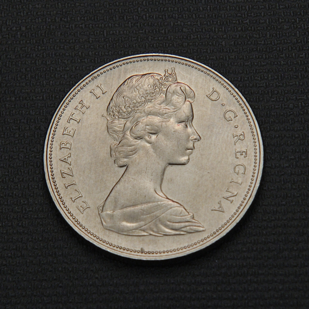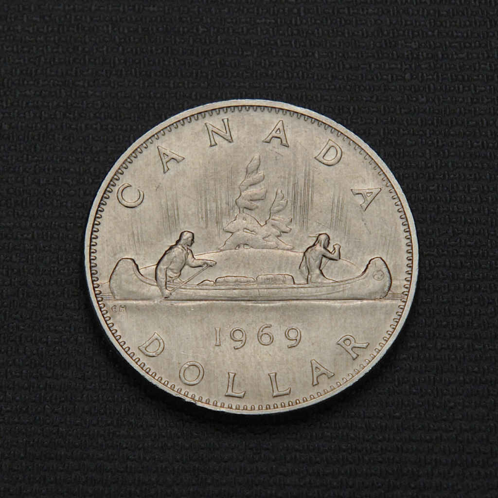 The 1969 Canadian 1 dollar coin, known as the Voyageur dollar, was issued by the Royal Canadian Mint for circulation. It is made from 100% nickel, weighs 15.62 grams, and measures 32.13 mm in diameter with a thickness of 2.62 mm. The coin features a reeded edge and is magnetically active. Its obverse depicts the portrait of Queen Elizabeth II, designed by Arnold Machin and Myron Cook, while the reverse portrays a voyageur and a First Nations man paddling a canoe, designed by Emanuel Hahn and Thomas Shingles. The mintage for this coin was approximately 4,809,313 pieces. This coin is significant as part of Canada’s pre-loonie dollar history before the introduction of the later gold-colored “loonie” in 1987.