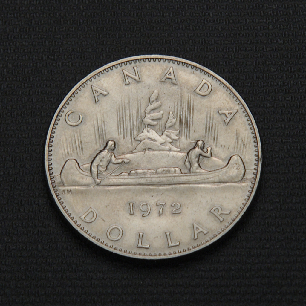 The 1972 Canadian 1 dollar coin, made of 100% nickel, features on the obverse a bust of Queen Elizabeth II wearing a laurel wreath, and on the reverse a design of a voyageur and a First Nations man paddling a canoe, symbolizing the fur trade, designed by Emanuel Hahn. It weighs 15.62 grams, has a diameter of 32.13 mm, a reeded edge, and was minted by the Royal Canadian Mint for circulation.