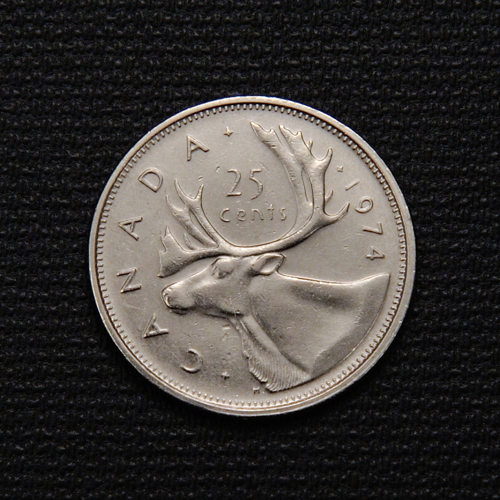 The 1974 Canadian 25 cents quarter features on the obverse a bust of Queen Elizabeth II wearing a tiara, and on the reverse a left-facing caribou head with the denomination “25 CENTS” positioned between the antlers, all struck in pure nickel with a magnetic, reeded edge and a diameter of 23.88 mm. The coin was minted by the Royal Canadian Mint in a business strike finish meant for circulation, with a mintage of over 192 million coins.