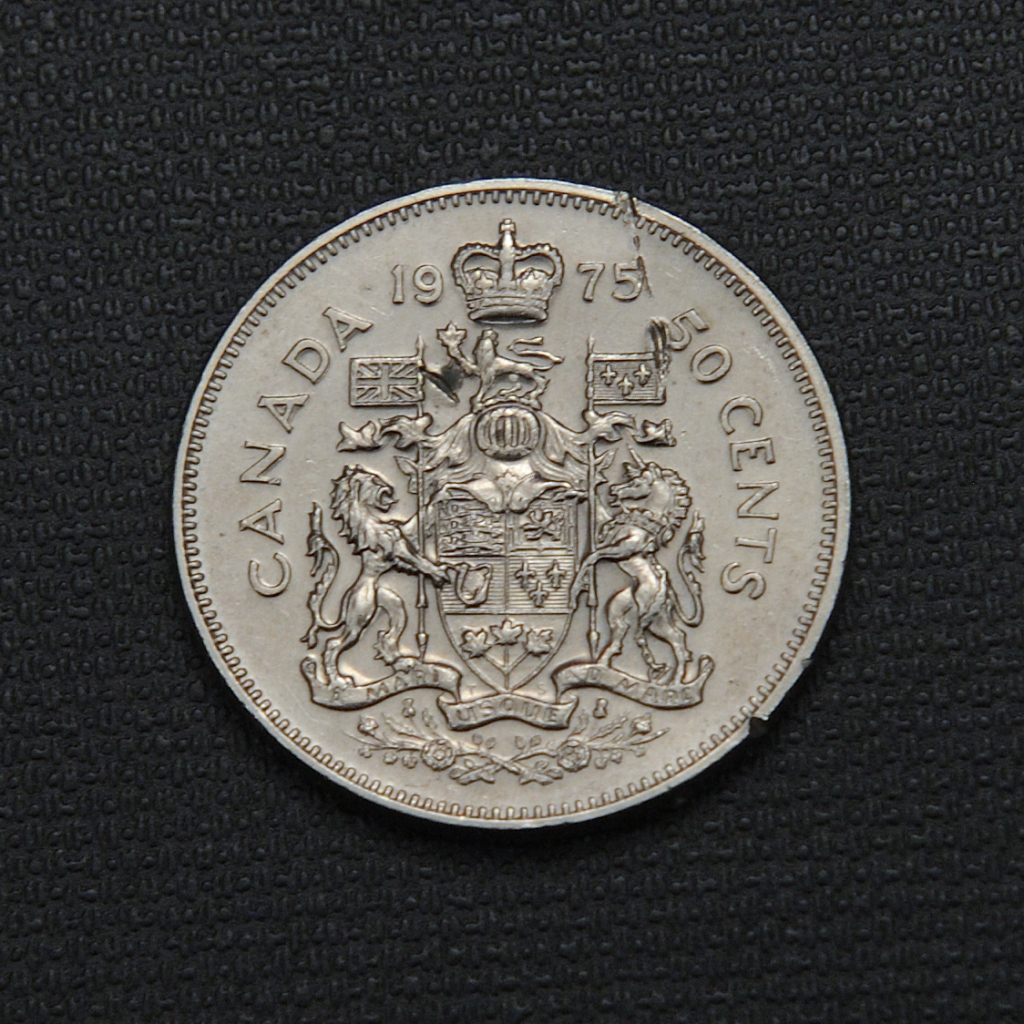 The 1975 Canadian 50 cents coin is a circulation strike coin made of 100% nickel, weighing 8.1 grams with a diameter of 27.13 mm and a reeded edge. The obverse side features a bust of Queen Elizabeth II wearing a tiara, designed by Arnold Machin, while the reverse showcases a stylized Canadian coat of arms designed by Thomas Shingles. The coin was minted by the Royal Canadian Mint with a mintage of approximately 3,710,000 pieces. This coin retains magnetic properties due to its nickel composition and was issued for general circulation in Canada in 1975.