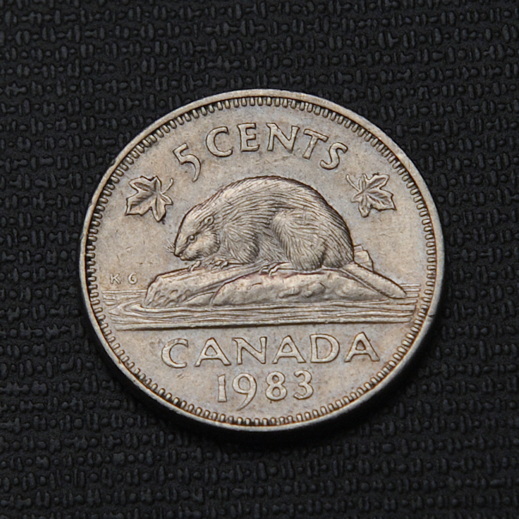 The 1983 five-cent Canadian coin is a traditional beaver nickel struck in cupro-nickel alloy with a Queen Elizabeth II portrait on the front.