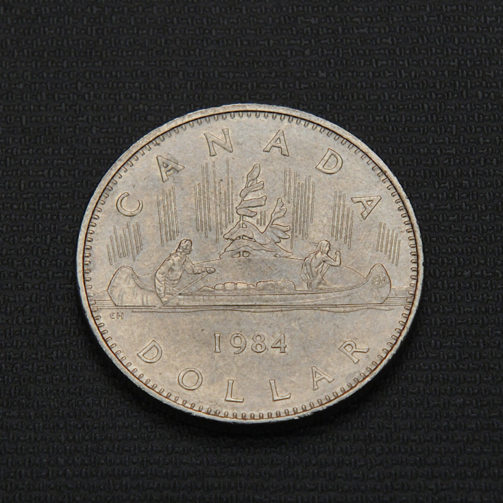 The 1984 Canadian 1 dollar coin, minted by the Royal Canadian Mint, commemorates the 450th anniversary of Jacques Cartier’s landing on the Gaspé Peninsula and features a design by Hector Greville depicting Cartier and a cross with the French coat of arms; it is struck in 100% nickel, weighs 15.62 grams, has a diameter of 32.13 mm, and carries on its obverse the bust of Queen Elizabeth II designed by Arnold Machin, while the reverse is distinctly marked with the dates “1534 JACQUES CARTIER 1984” and issued with a mintage of over six million for circulation.