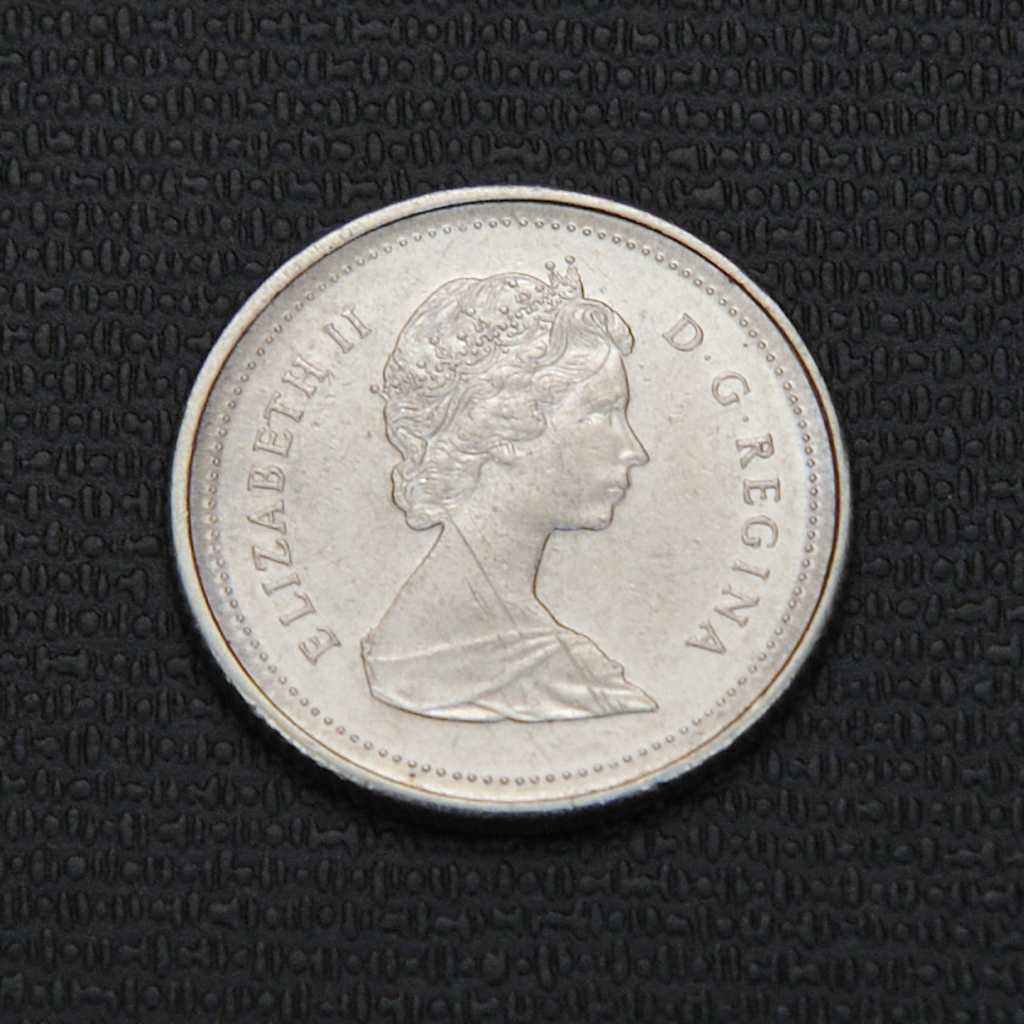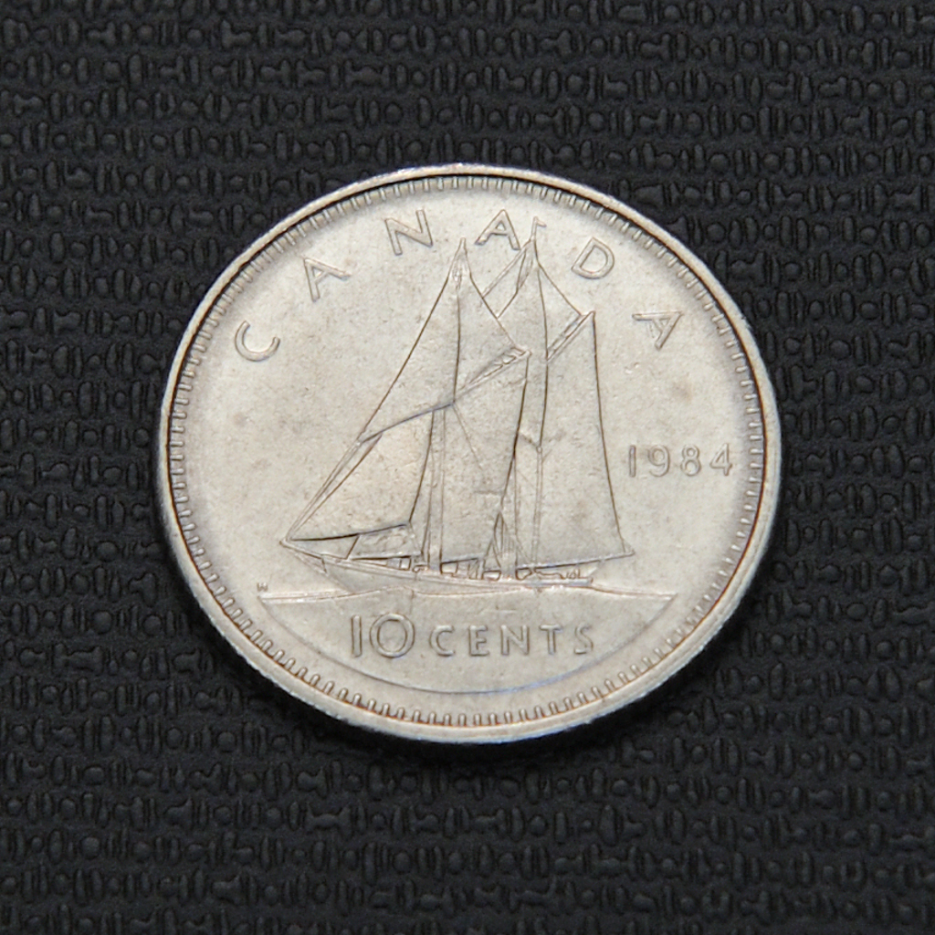 The 1984 Canadian 10 cents coin features the iconic Bluenose schooner on its reverse, a symbol of the maritime heritage and the fishing industry of Canada, designed by Emanuel Hahn based on photos of the famous Nova Scotia racing ship. The obverse displays a right-profile portrait of Queen Elizabeth II wearing a tiara, designed by Arnold Machin, with the inscription “ELIZABETH II D – G – REGINA.” The coin is made of nickel, has a diameter of 18.03 mm, weighs 2.07 grams, and has a reeded edge. It was minted by the Royal Canadian Mint with a circulation mintage of approximately 119 million coins. The 1984 dime retains the traditional medal alignment and was produced in various finishes, including circulation, uncirculated, specimen, and proof versions.