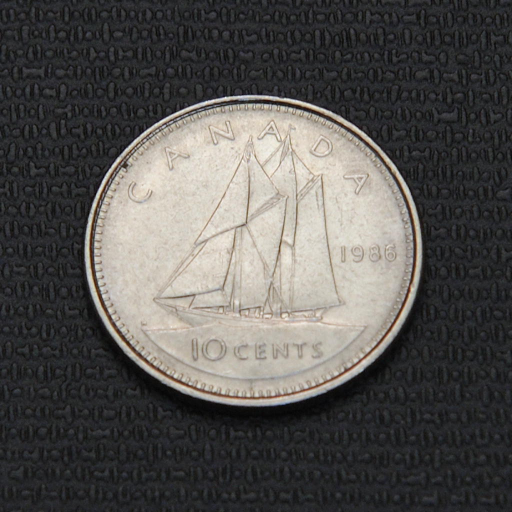 The 1986 Canadian 10-cent coin is a nickel coin featuring Queen Elizabeth II on the obverse and the famous Bluenose schooner on the reverse, symbolizing Canadian maritime history.