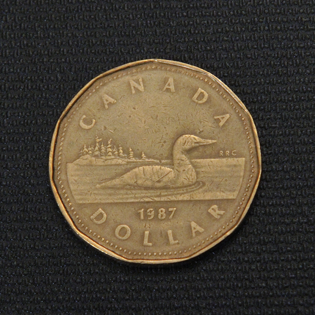 The 1987 Canadian 1 dollar “loonie” coin is an 11-sided gold-toned coin featuring a loon on the reverse and Queen Elizabeth II on the obverse.