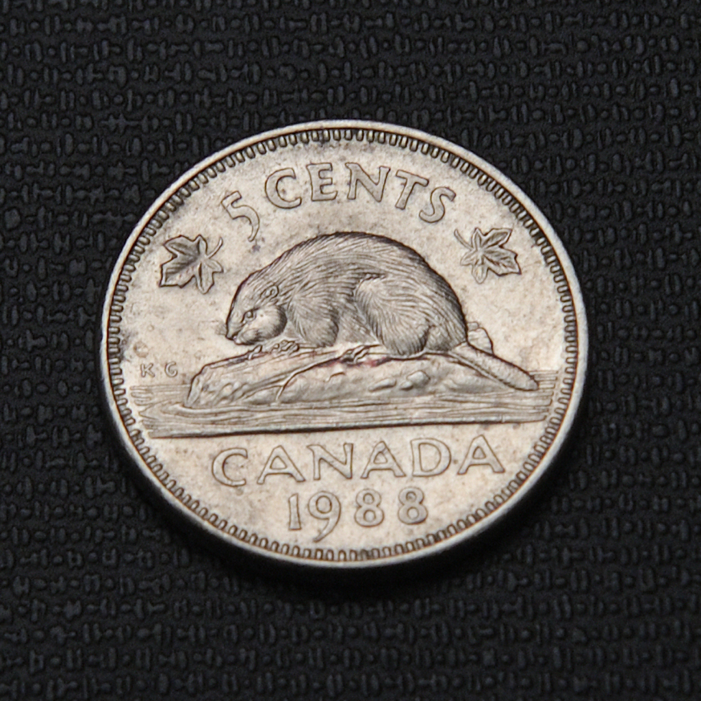 In 1988, Canada’s 5 cents coins showcased a beaver design, Queen Elizabeth II, and were made with copper and nickel.