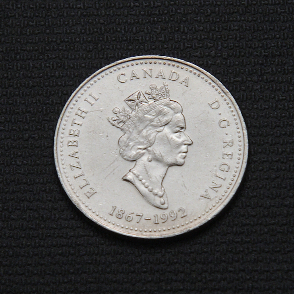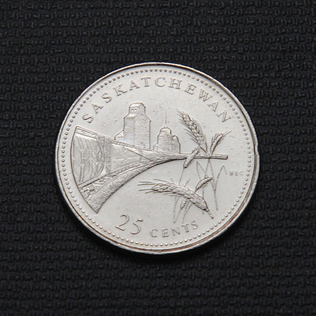 The 1992 Canadian 25-cent coin for Saskatchewan, issued for the 125th Anniversary of Confederation, depicts the Prairies with its treeless landscape, wheat fields, grain elevators, and a freight train, symbolizing the province’s agricultural heritage. The coin’s obverse features Queen Elizabeth II’s effigy designed by Canadian artist Dora de Pédery-Hunt.
