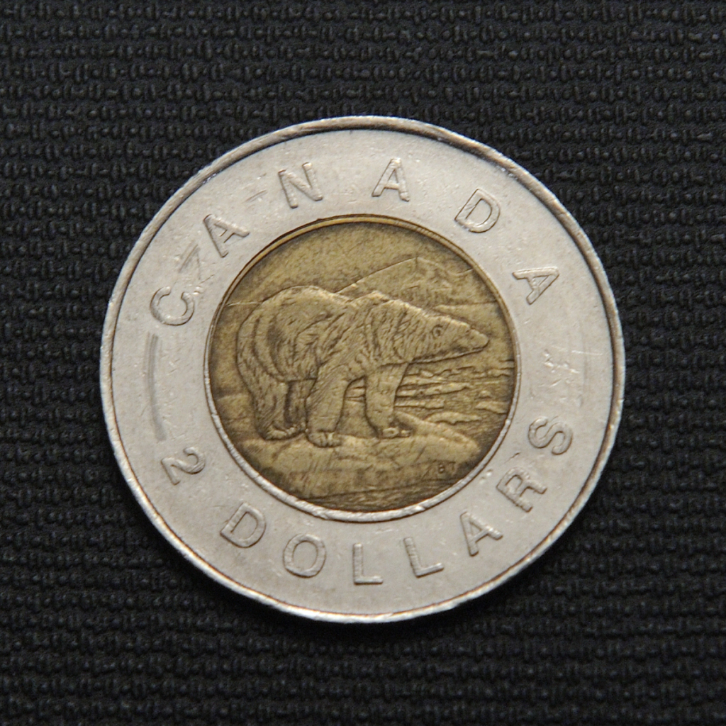The 1997 Canadian 2-dollar coin, popularly known as the “Toonie,” is a bi-metallic coin featuring an outer ring composed of 100% nickel and an inner core made of 92% copper, 6% aluminum, and 2% nickel, weighing 7.3 grams and measuring 28 mm in diameter. Its reverse side displays an iconic adult polar bear on an ice floe, designed by Brent Townsend, while the obverse bears the effigy of Queen Elizabeth II, created by Dora de Pedery-Hunt, with the inscriptions “ELIZABETH II D. G. REGINA” and a maple leaf. The coin was introduced in 1996 to replace the 2-dollar bill and has an interrupted edge as well as a patented locking mechanism joining the two metal parts, making it both durable and visually distinctive. In 1997, 16,942,000 of these coins were minted for circulation, maintaining their status as the highest denomination in Canadian coinage.