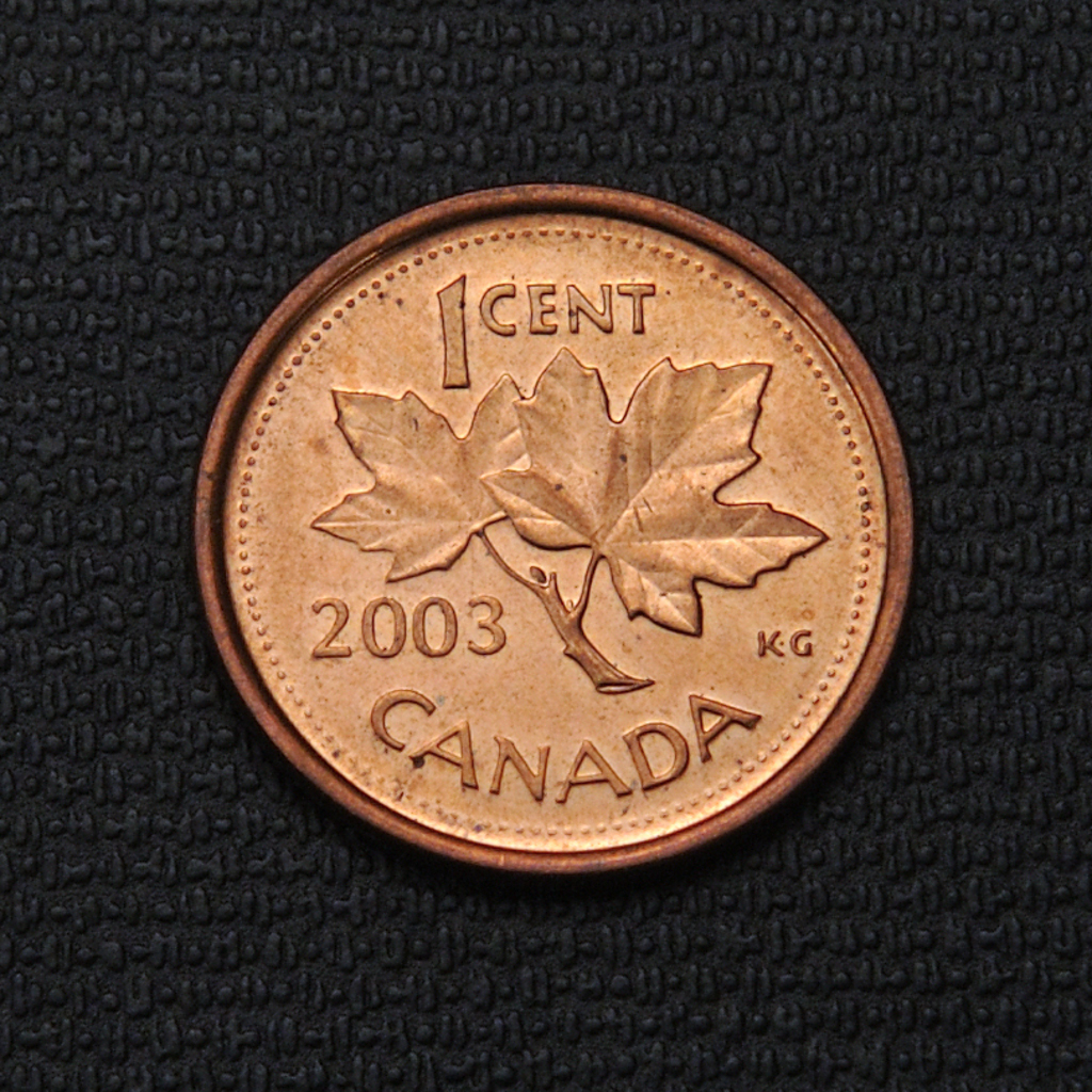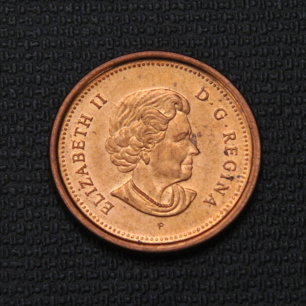 The 2003 Canadian 1-cent “New Effigy – P” is a copper-plated steel penny showing the new uncrowned portrait of Queen Elizabeth II and the maple leaf design, marked with a “P” for plated steel.
