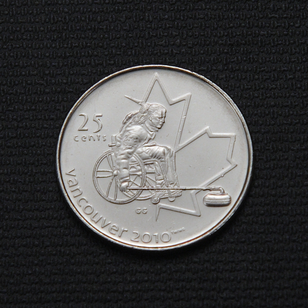 In 2007, Canada commemorated wheelchair curling in the context of the Vancouver 2010 Olympic and Paralympic Winter Games by issuing a special 25-cent circulation coin. This coin features a design by Glen Green depicting a wheelchair curling player in front of a maple leaf. It was part of an extensive Canadian coin program honoring the 2010 Games, which included a series of circulation and collector coins related to various Olympic and Paralympic sports. The wheelchair curling coin is inscribed with “25 cents” and “VANCOUVER 2010” and was circulated in a substantial mintage of about 22.4 million coins. This issuance highlighted wheelchair curling, which had been officially introduced as a Paralympic medal sport in 2006, underscoring Canada’s recognition and support for Paralympic sports.
