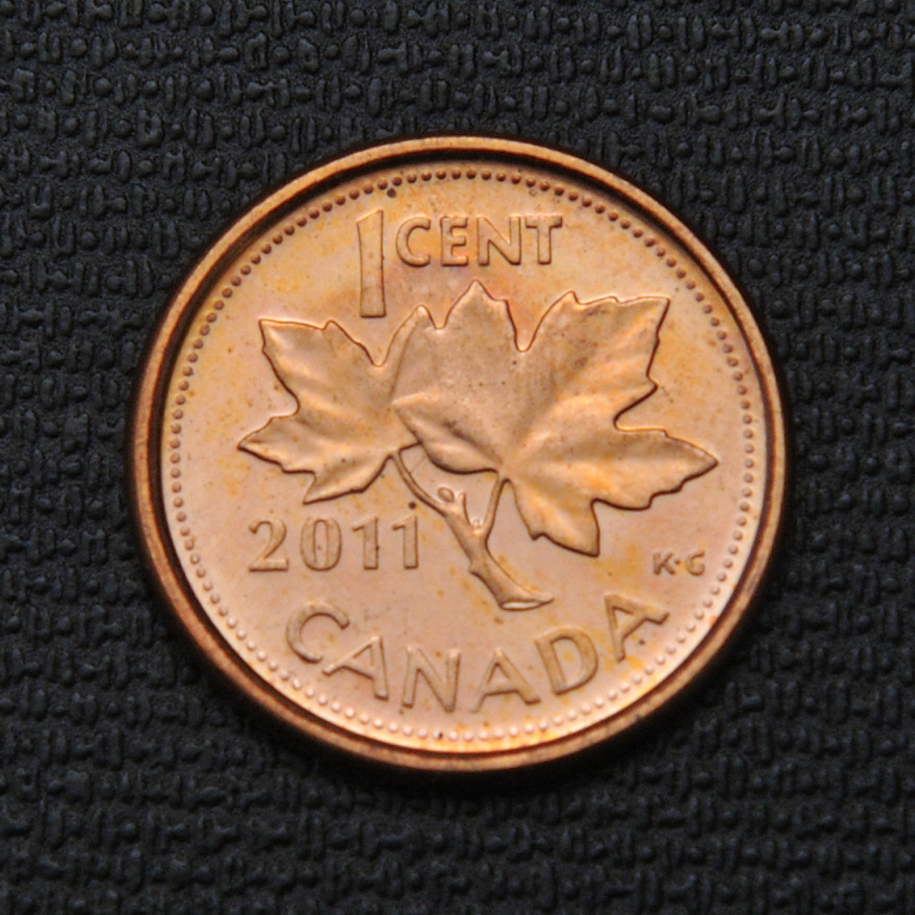 The 2011 Canadian non-magnetic penny is a copper-plated zinc coin featuring an uncrowned Queen Elizabeth II and two maple leaves on a twig, weighing 2.25 g and measuring 19.05 mm, with a smooth edge and no magnetic properties.