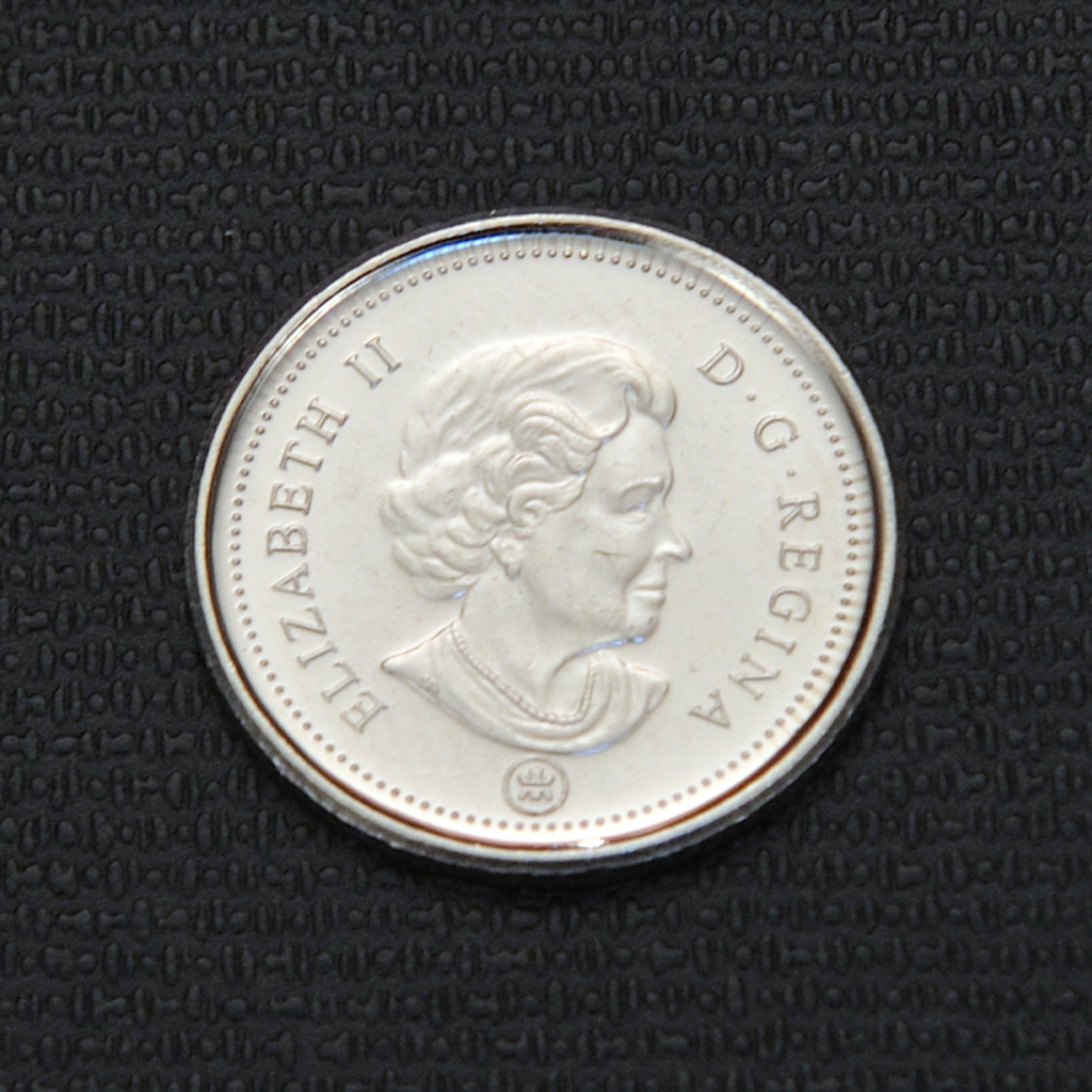 The 2013 Canadian dime prominently features the Bluenose schooner on the reverse and Queen Elizabeth II on the obverse, made with a steel core and nickel-copper plating.