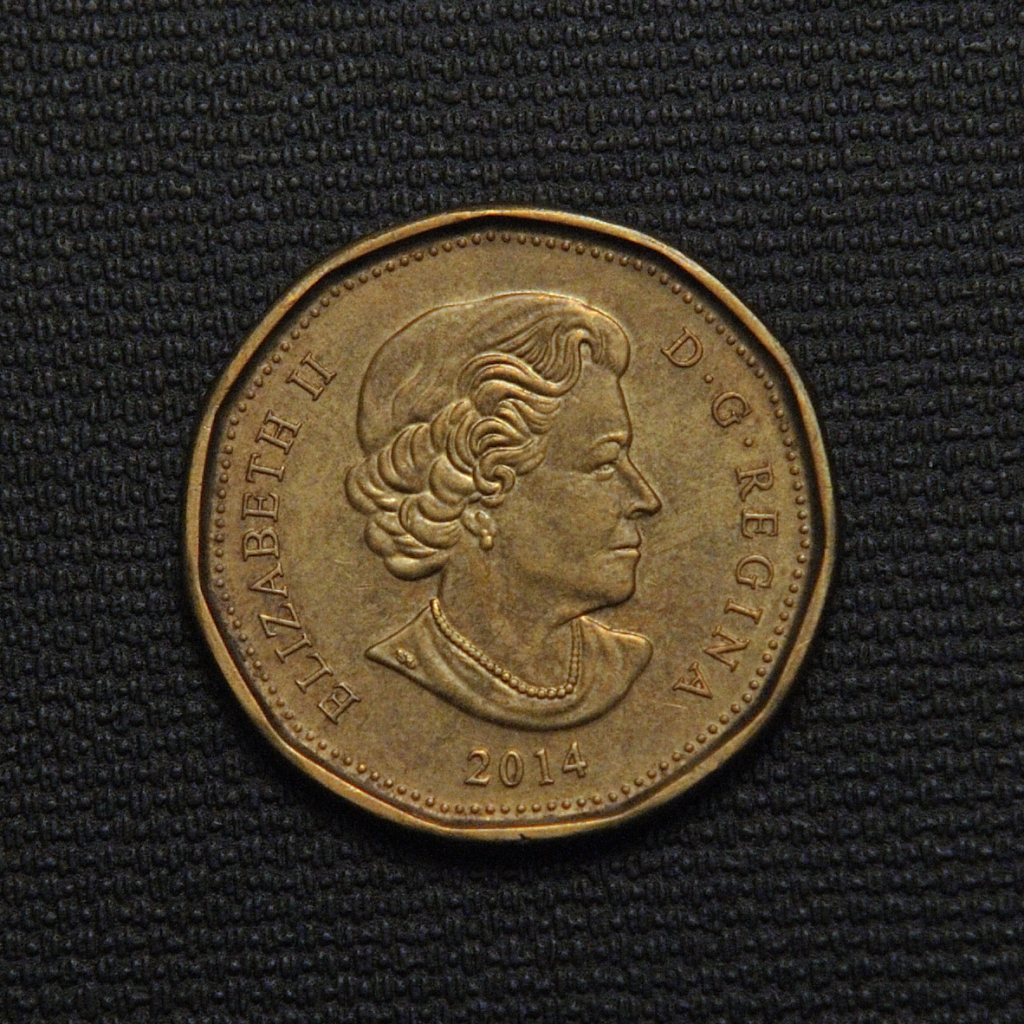 The 2014 Canadian 1 dollar coin, known as the “Lucky Loonie,” is a brass-plated steel coin weighing 6.27 grams with a diameter of 26.5 mm and an 11-sided smooth edge. It features the uncrowned bust of Queen Elizabeth II on the obverse, designed by Susanna Blunt, and on the reverse, the iconic common loon spreading its wings while sitting on rippling lake waters, designed by Emily Damstra. This special edition coin celebrates the Canadian Olympic Team at the Sochi 2014 Winter Olympic and Paralympic Games, displaying the Canadian Olympic Team logo in red coloring beside the loon. The “Lucky Loonie” tradition originates from 2002 when a loonie was buried under the ice at the Olympic hockey venue for good luck, and since then, the Royal Canadian Mint has issued special “Lucky Loonie” coins for subsequent Olympics.