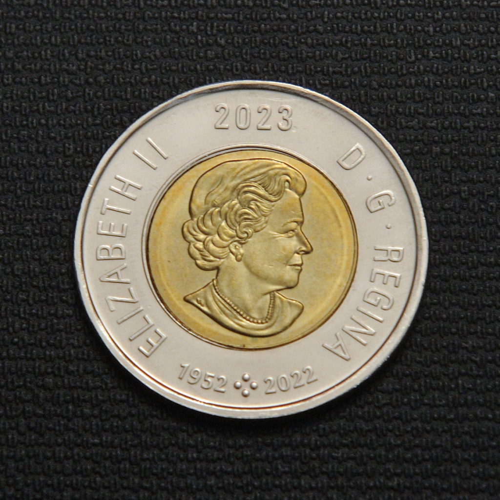 The 2023 Canadian $2 coin commemorates the 100th anniversary of the birth of Jean Paul Riopelle (1923-2002), a globally revered Canadian artist. The uncolored version of this coin features on its reverse select elements adapted from Panel 29 of Riopelle’s 1992 masterpiece “L’Hommage à Rosa Luxemburg,” showing spray-painted bird-like silhouettes symbolic of the work. The coin’s outer ring includes the “Riopelle100” centenary mark from the Riopelle Foundation, while the obverse displays the effigy of Queen Elizabeth II by Susanna Blunt with a special marking of four pearls signifying the four effigies on Canadian coins and the double date of the Queen’s reign. The coin has a composition of a three-ply nickel-plated steel outer ring and a three-ply brass-plated aluminum bronze inner core, with a weight of 6.99 grams and a diameter of 28 mm. It is issued as a circulation coin with a mintage limit of three million, one million of which are uncolored, uncirculated, and available in special wrap rolls of 25 coins each.