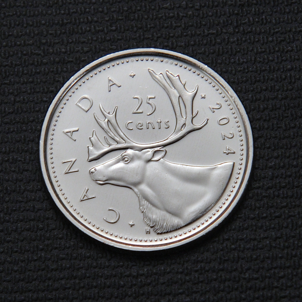 The 2024 Canadian 25‑cent coin features the iconic caribou design on its reverse, with Queen Elizabeth II’s effigy on the obverse, struck in nickel-plated steel and serving as a standard circulation quarter.