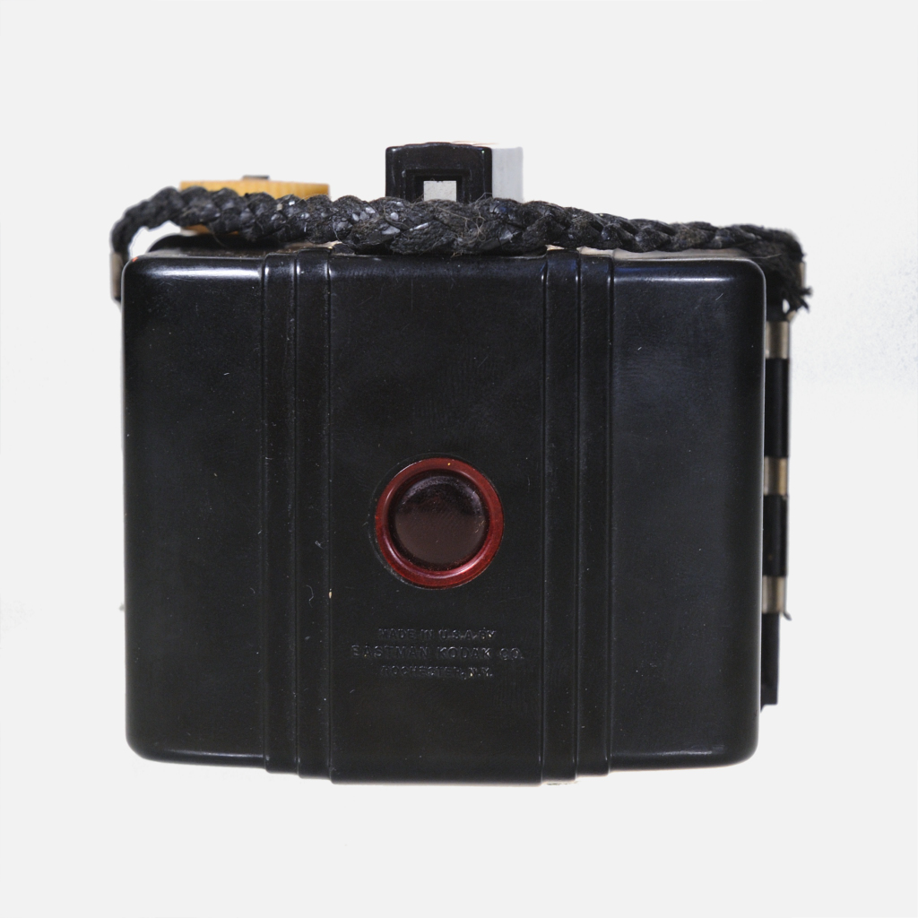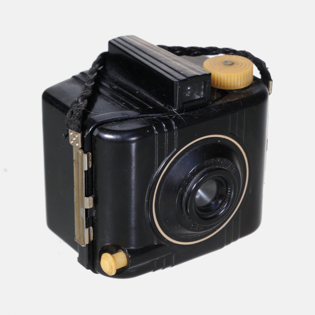 CamerasThe Kodak Baby Brownie Special is a small, simple box camera made of bakelite, featuring a fixed-focus meniscus lens, a telescopic optical viewfinder, a side-mounted shutter release button, and using 127 roll film to produce eight 4×6 cm exposures, introduced in 1939 as an upgraded, affordable entry-level camera designed by Walter Dorwin Teague with distinctive art deco styling.