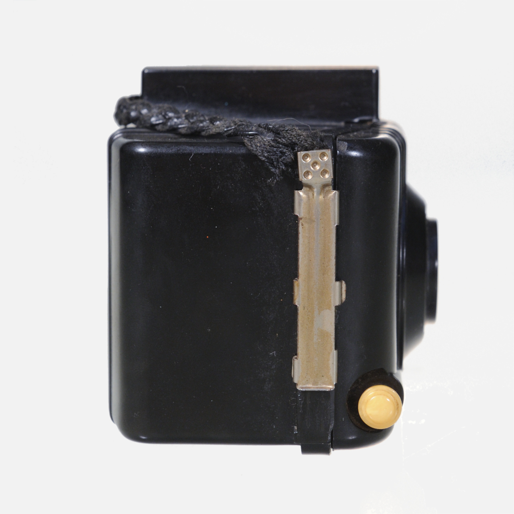 The Kodak Baby Brownie Special, produced from 1939 to around 1952, is a compact medium format box camera made with a Bakelite body and designed by Walter Dorwin Teague in an Art Deco style. It uses 127 roll film to produce eight 4cm x 6cm exposures, features a fixed-focus 65mm f/16 meniscus lens, a rotary shutter with about 1/40 to 1/50 second speed, and a distinctive telescopic glass optical viewfinder. This camera was a popular, affordable entry-level camera with a side-mounted plastic shutter release button and a carrying handle, making it a practical and stylish choice for casual photographers, selling initially for just $1.25. Its simple construction includes no battery or flash mount, and it was designed to be easy to use for everyday snapshots, producing relatively sharp images with a vintage lo-fi charm.