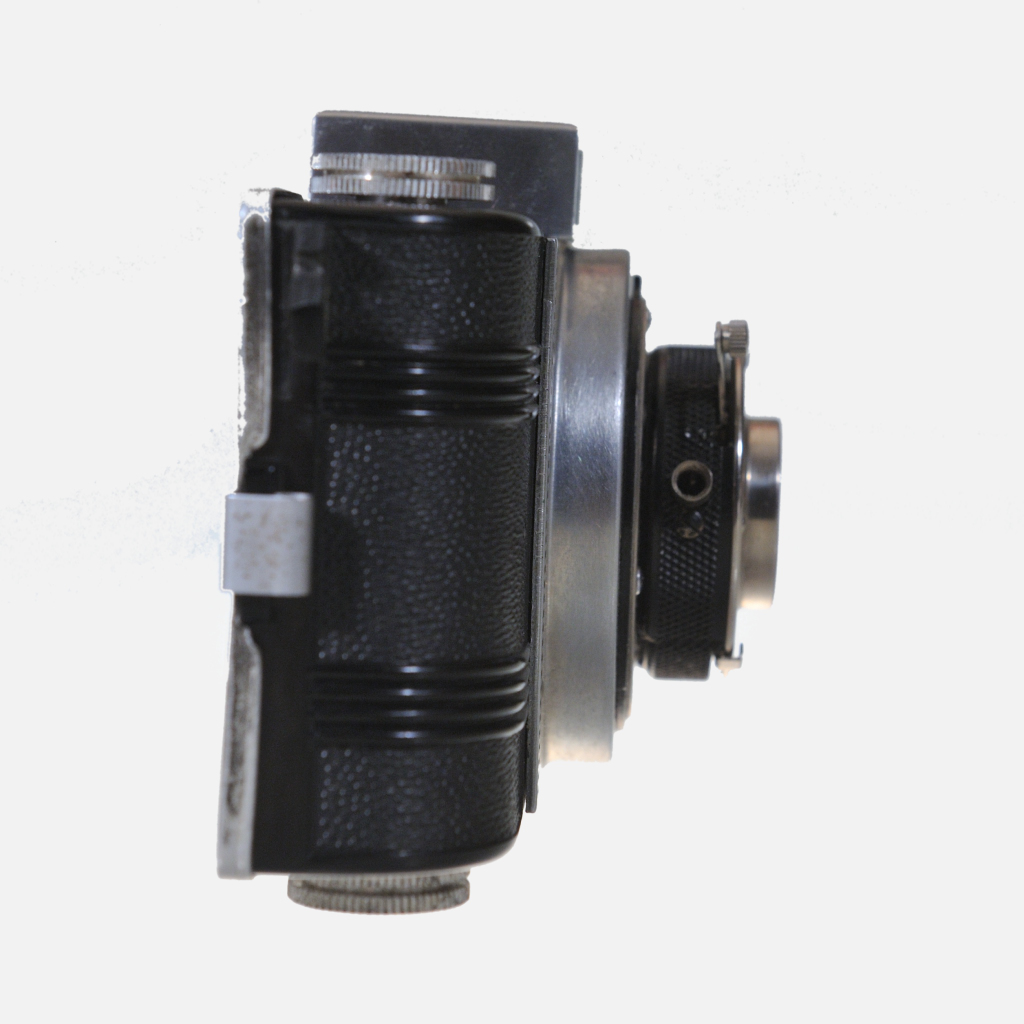 The Detrola Model K is a higher-spec bakelite camera designed for taking 3×4 cm images on 127 film. Released around 1940 and priced at about $22.50, it was more expensive than other models like the Model G. Its standout feature is the color-corrected Wollensak 2-inch f/3.5 lens, which is approximately two-thirds of a stop faster than the f/4.5 lenses found on other Detrola models. It shares the extinction meter feature with the Model H and is sometimes seen as the Model KW, indicating the use of a Wollensak lens, although the original Model K also used these lenses. The camera embodies distinctive Art Deco styling typical of its time and offers straightforward controls, but with build quality considered somewhat basic compared to contemporaries from Germany.