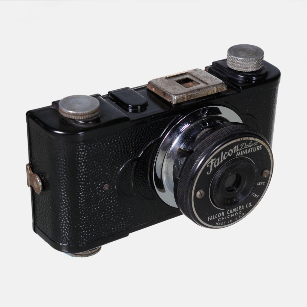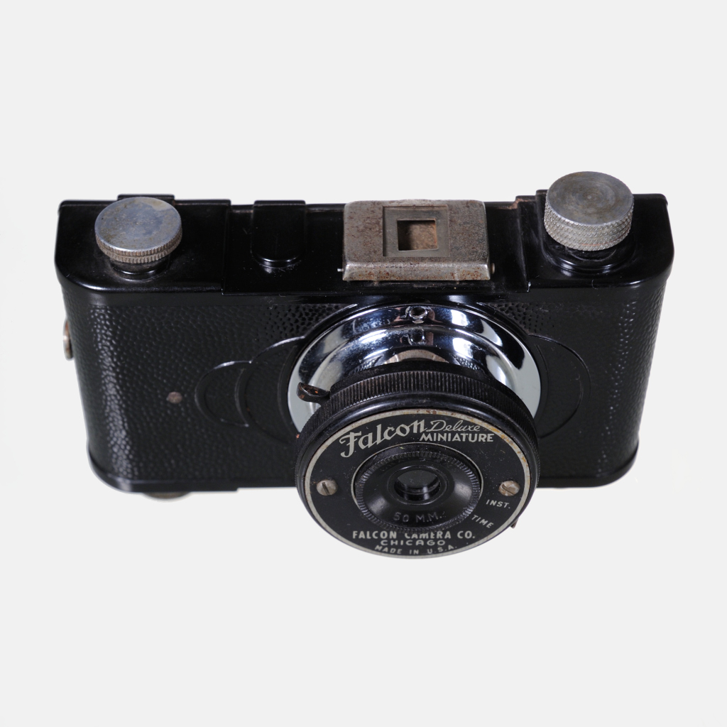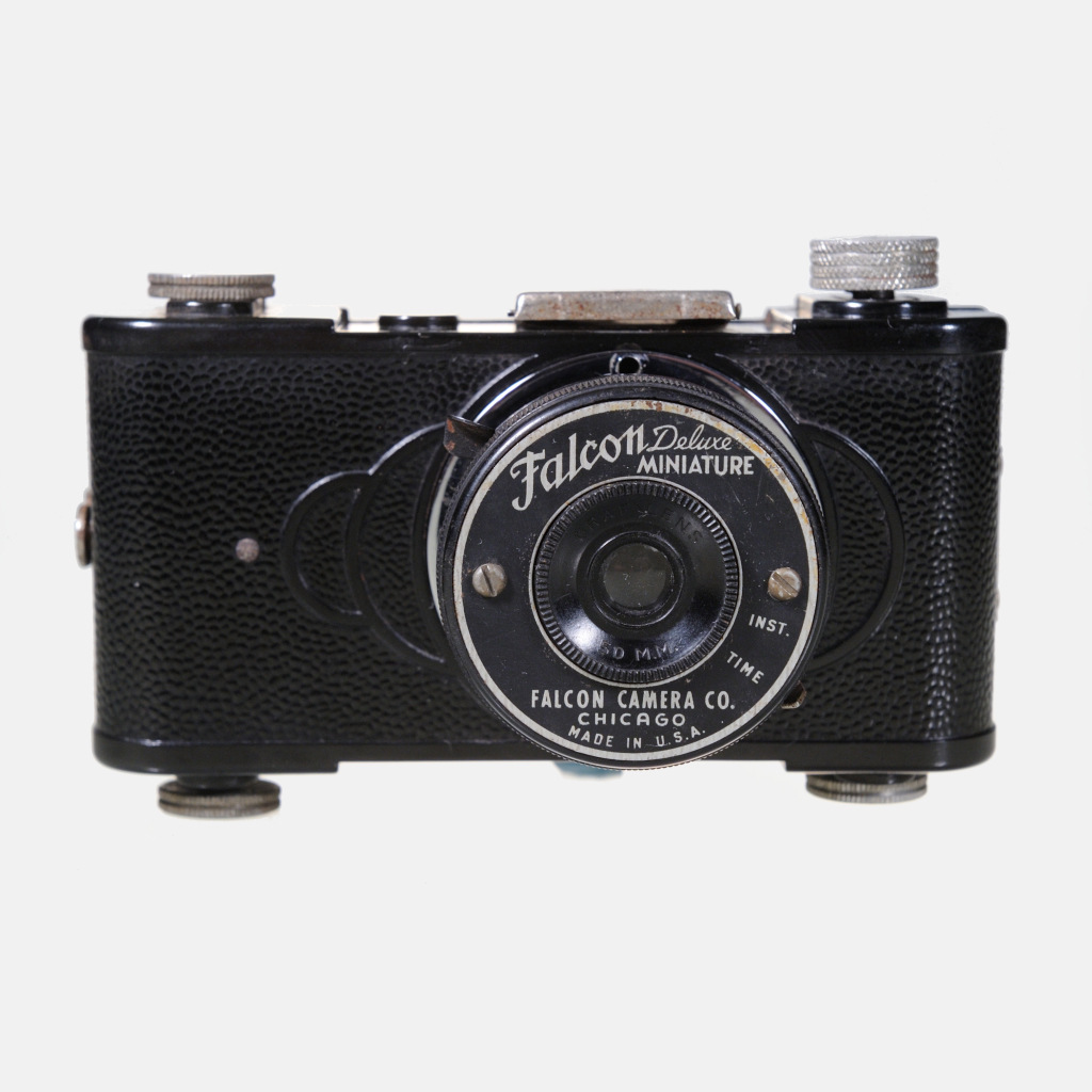 CamerasThe Falcon Miniature Deluxe camera is a vintage 1939 Bakelite-bodied 127 film camera with a fixed-focus 50mm Graf lens, a single shutter speed of 1/25, half-frame 3×4 cm exposures, and a unique dual red window film advance system, originally made by the Utility Manufacturing Company in New York.