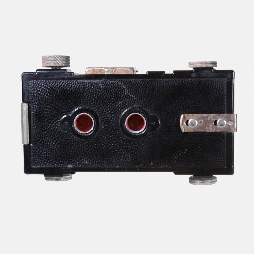 The Falcon Miniature Deluxe Camera, introduced around 1939 by the Utility Manufacturing Company in New York, is a classic 127 film camera notable for its Bakelite body and simple yet distinctive design inspired by the 35mm Argus A. It features a fixed-focus 50mm Graf lens, fixed aperture, and a single shutter speed of 1/25 second with bulb mode. The camera takes half-frame photos sized 3×4 cm on 127 film and has a unique dual red window system for advancing the film, allowing for up to 16 exposures per roll. Additionally, it includes a compartment for storing an extra film roll, a simple optical viewfinder, and a compact, lightweight build (weighing about 148 grams). This camera, cherished by collectors and vintage photography enthusiasts, offers an artistic, though somewhat soft-focused image quality characteristic of its era and was available in several body styles, including the Deluxe model. It is prized for its vintage charm and quirky functionality rather than technical precision.