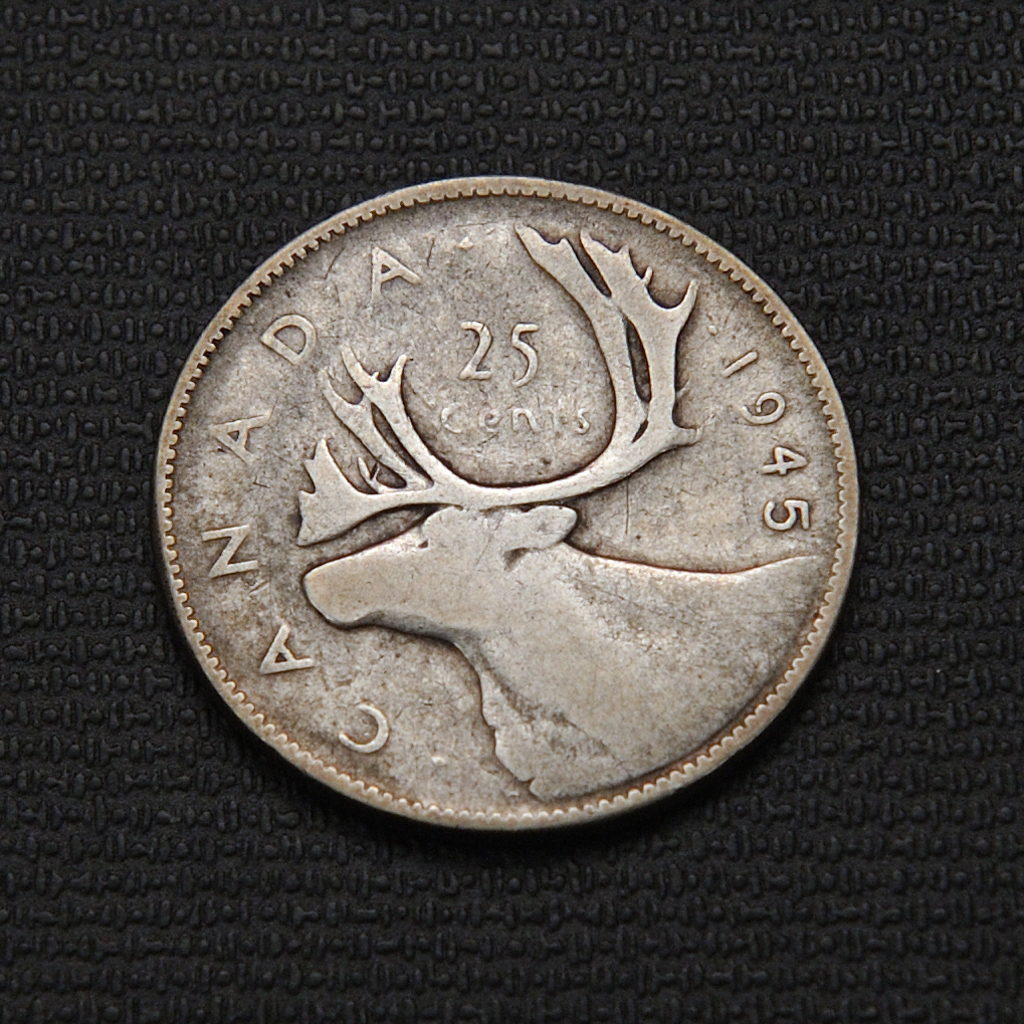 The 1945 Canadian 25-cent coin, commonly called a quarter, is composed of 80% silver and 20% copper, with a total weight of 5.83 grams and a diameter of 23.62 mm. It features the obverse design of King George VI, created by Thomas Humphrey Paget, with the inscription “GEORGIVS VI D : G : REX ET IND : IMP :,” and the reverse depicts a caribou head, designed by Emanuel Hahn, along with the denomination “25 CENTS” and the country name “CANADA.” Minted by the Royal Mint, this non-magnetic coin has a reeded edge and medal alignment orientation. Its mintage was about 5.3 million pieces, making it a moderately common collector’s item with silver melt value as of mid-2025 around $7.36 CAD, with higher value for coins in uncirculated or mint state condition. It remains a significant and historic piece of Canada’s numismatic heritage.