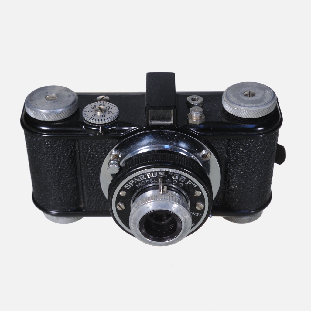 The Spartus 35F Model 400 is a simple 35mm Bakelite camera with a scale-focusing lens, three selectable apertures, and a preset shutter speed, known for its basic design and vintage charm.