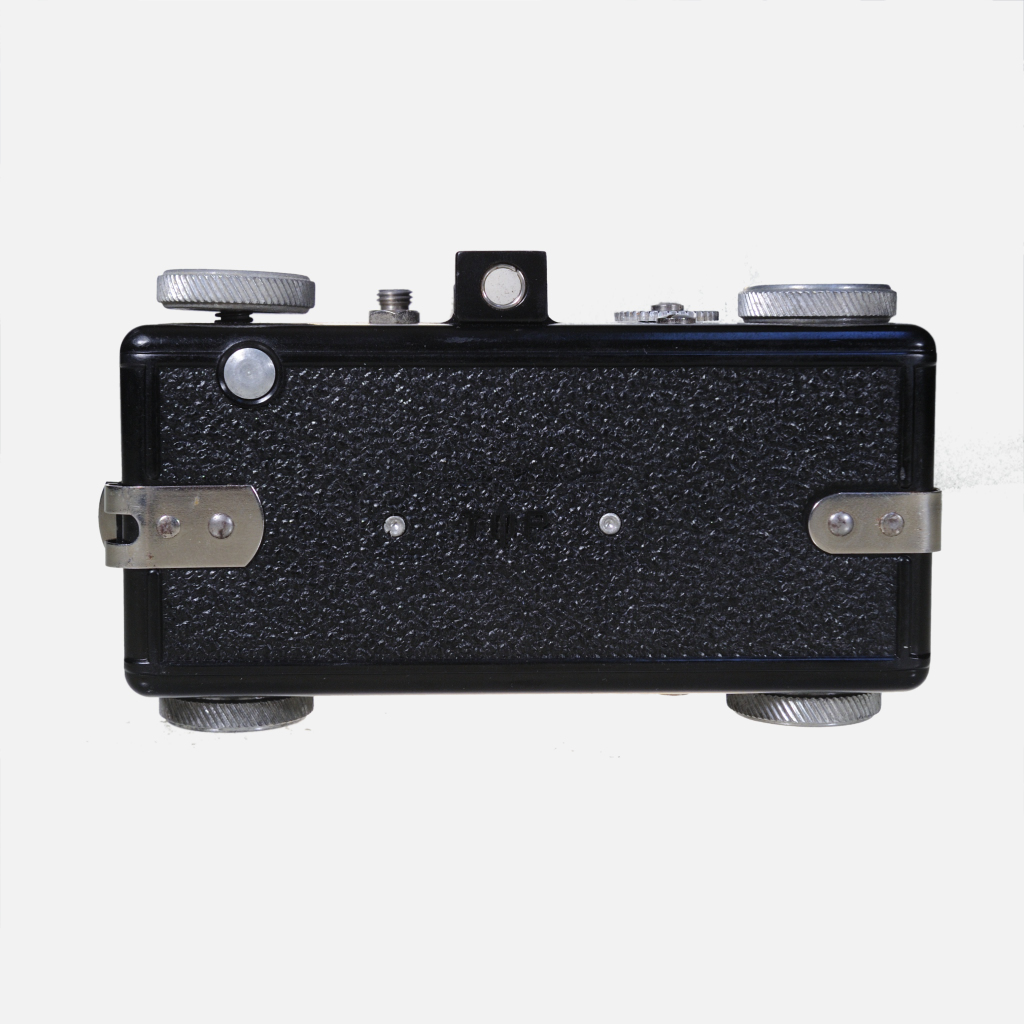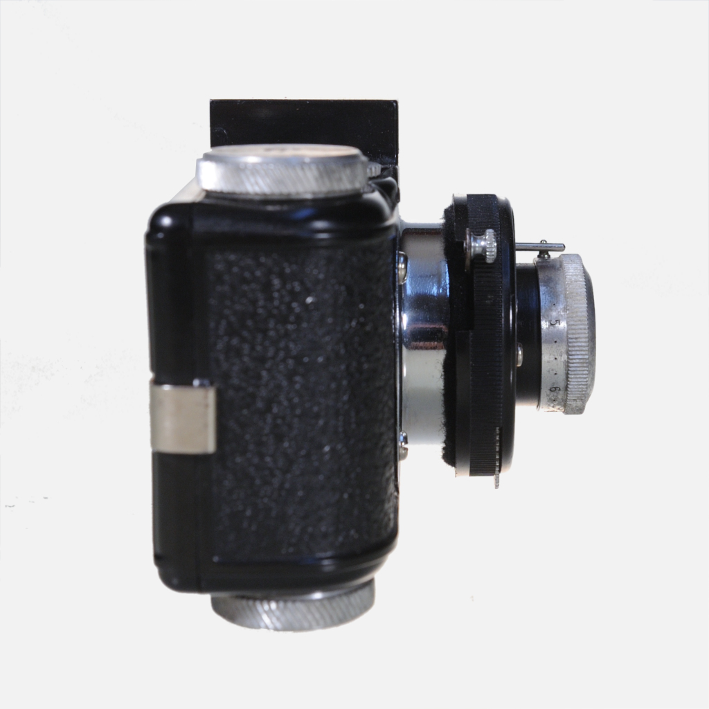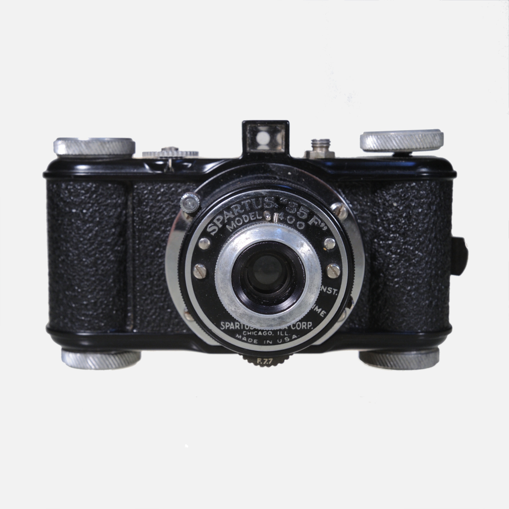The Spartus 35F Model 400 is a basic, vintage 35mm viewfinder camera made in the late 1940s to early 1950s in Chicago by Spartus Corp., later Herold Manufacturing Co.; it features a Bakelite body, a simple 50mm lens with scale focusing from 4 feet to infinity, three preset apertures (f/7.7, f/11, f/16) plus a K2 filter, and a fixed shutter speed of 1/50 second with a bulb mode for longer exposures; the camera has a rewind knob, a threaded flash sync socket (hence the “F” in the name), a removable back for film loading, and film advance knob on the bottom, making it a compact, quirky, and collectible low-fi camera popular during the post-war photography boom for its simple operation and typical rough finish for the era.