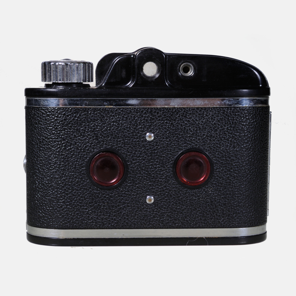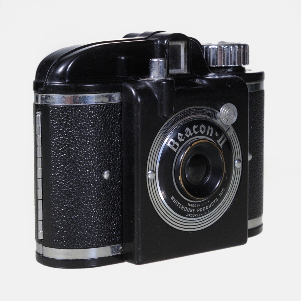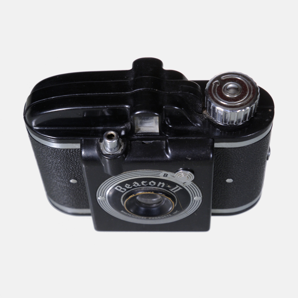 CamerasThe Beacon II vintage camera, made from 1947 to 1955 by Whitehouse Products Inc. of Brooklyn, is a compact Bakelite-bodied camera that captures sixteen 3×4 cm exposures on 127 roll film with a fixed 46mm f/11 Whitmar coated lens, a single-speed 1/50 second rotary shutter, flash sync capability, and a built-in optical viewfinder.