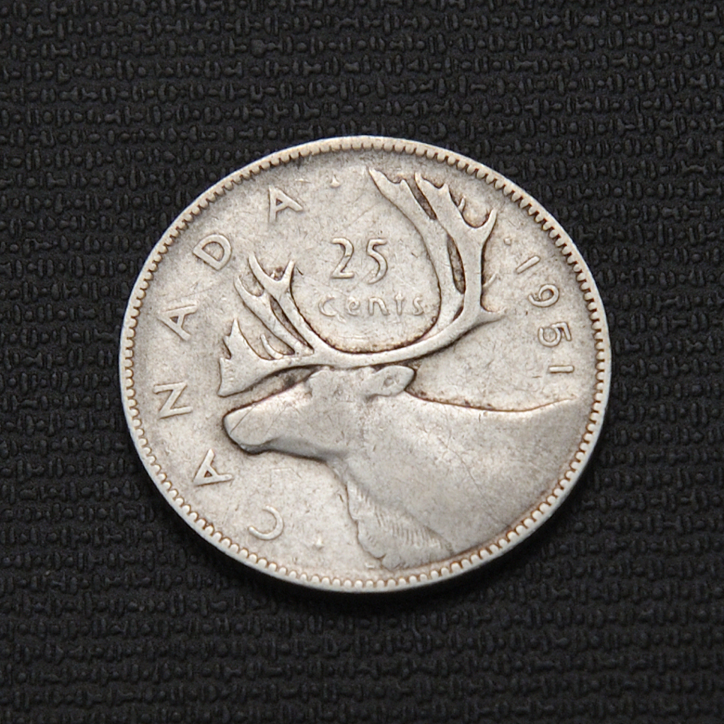 The 1951 Canadian 25-cent coin is composed of 80% silver and 20% copper, weighing 5.83 grams with a diameter of 23.62 mm, featuring a reeded edge. The obverse displays a high-relief portrait of King George VI designed by Thomas Humphrey Paget, while the reverse showcases a caribou head crafted by Emanuel Hahn. This coin was minted in a large circulation amount of approximately 8.29 million pieces by the Royal Canadian Mint, and its silver content gives it a melt value above its face value, making it valued among collectors mostly for its silver and condition. It has both high relief and low relief varieties, distinguished by details in the lettering on the obverse, with the 1951 high relief being common in proof-like conditions but rarer in regular circulation.